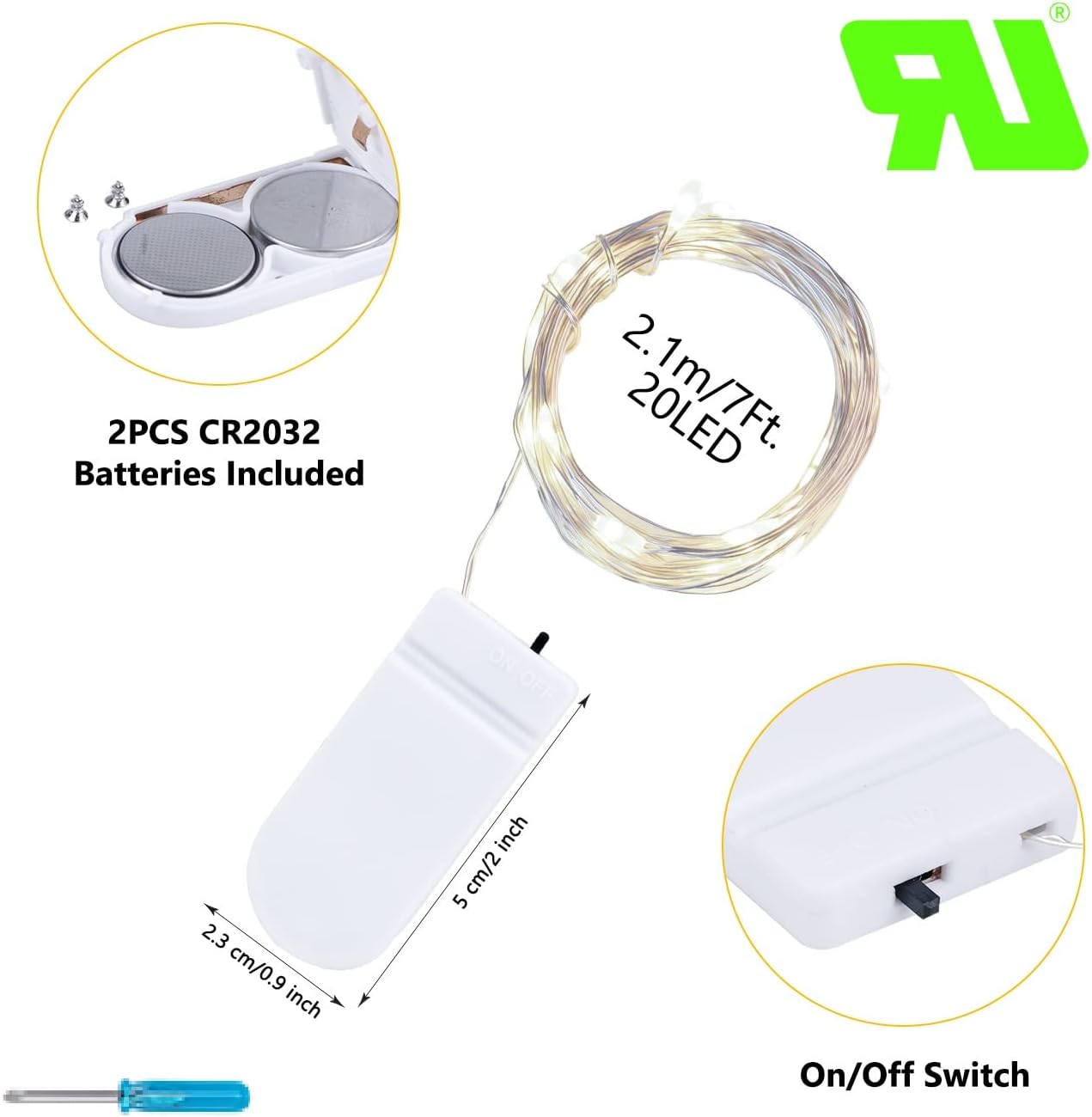 - 【 24 Pack Battery Operated LED Fairy Lights 】- Powered by 2 CR2032 batteries (included), the 7 feet micro fairy light with 20 upgraded energy-efficient LEDs is perfect for both everyday decorations as well as holiday decor. The thin copper wiring and small -sized LED bulbs will add a delicate and cozy touch to your personal space.