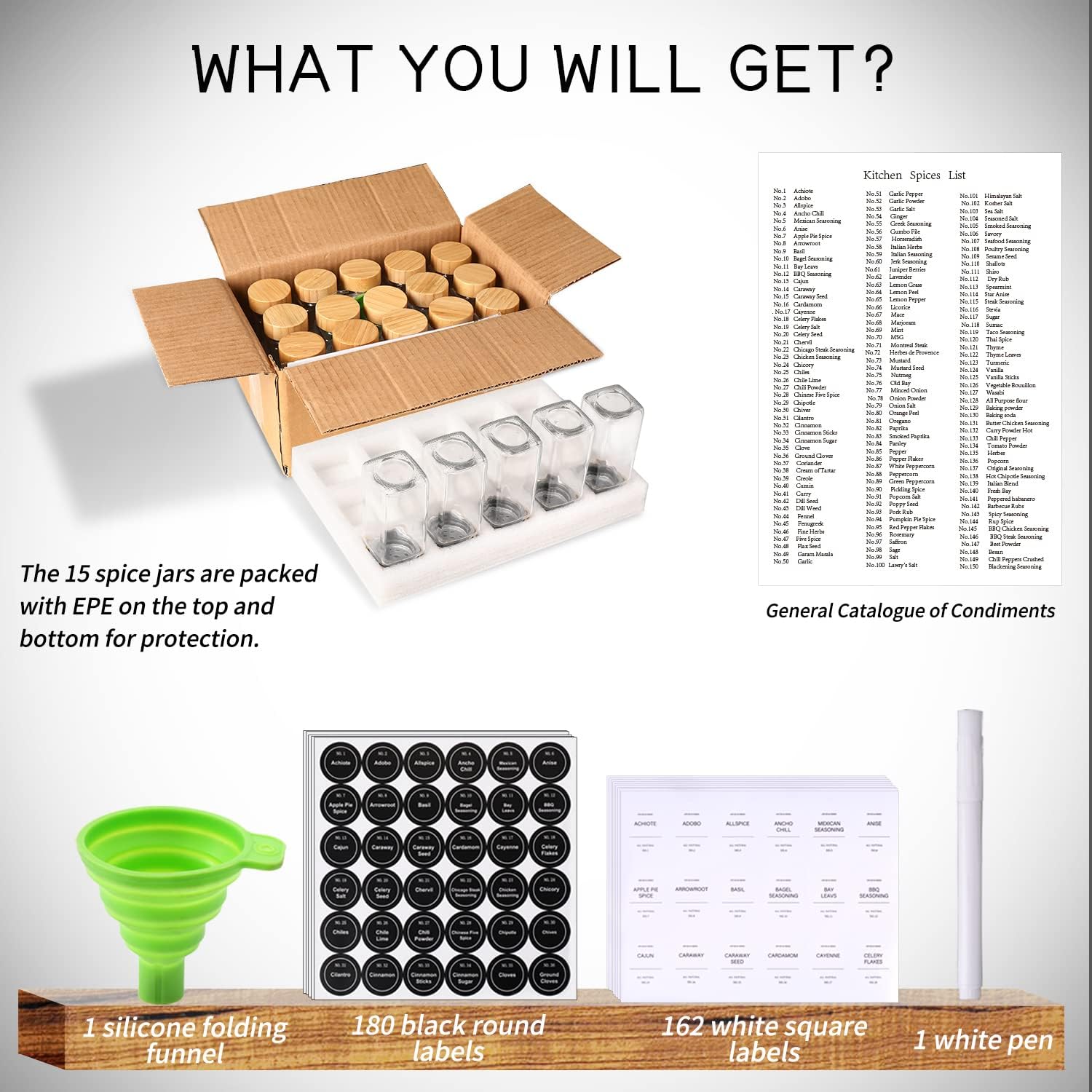 - Complete 4 oz Spice Jars Set: This kitchen essentials for new home set includes 24 glass spice jars with bamboo lids, 1 spice catalog, 180 black round labels, 162 white square labels, 1 white marker, and 1 funnel for refilling