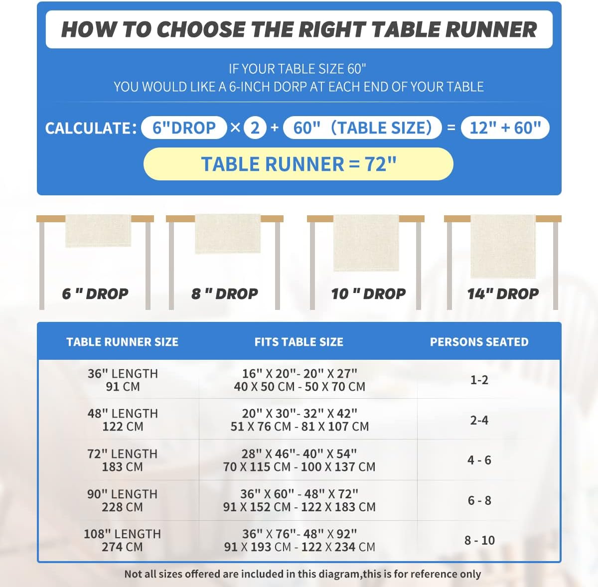 - Fits Table Size : This table runner is 13 x 36 inch, appropriate for a table that can seat 1-2 people, better match your table and give you a delightful dining experience