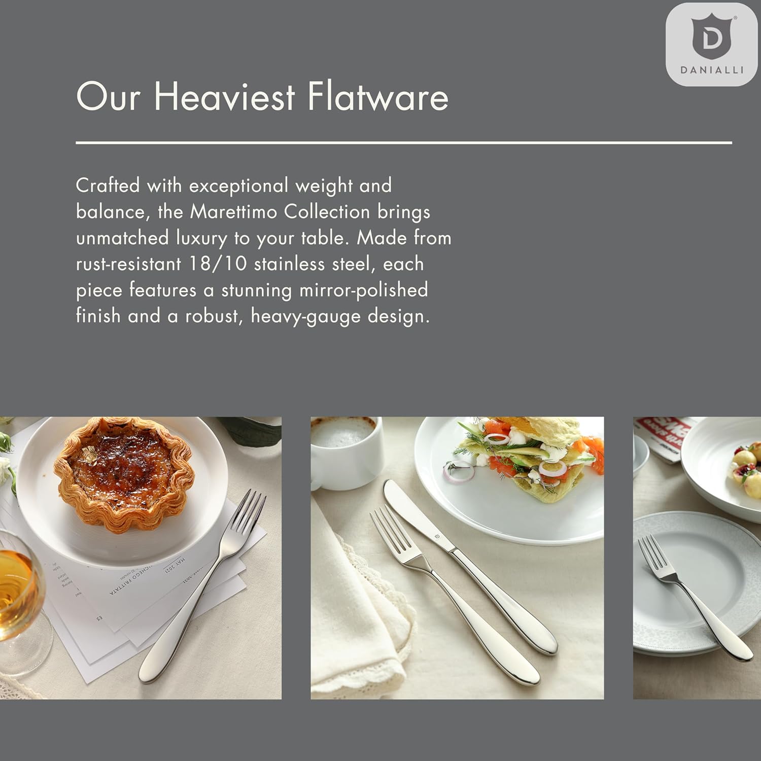 - The heaviest in DANIALLI's collection: Crafted from solid 18/10 stainless steel, each piece delivers a well-balanced, substantial grip you’ll feel the moment you pick it up.