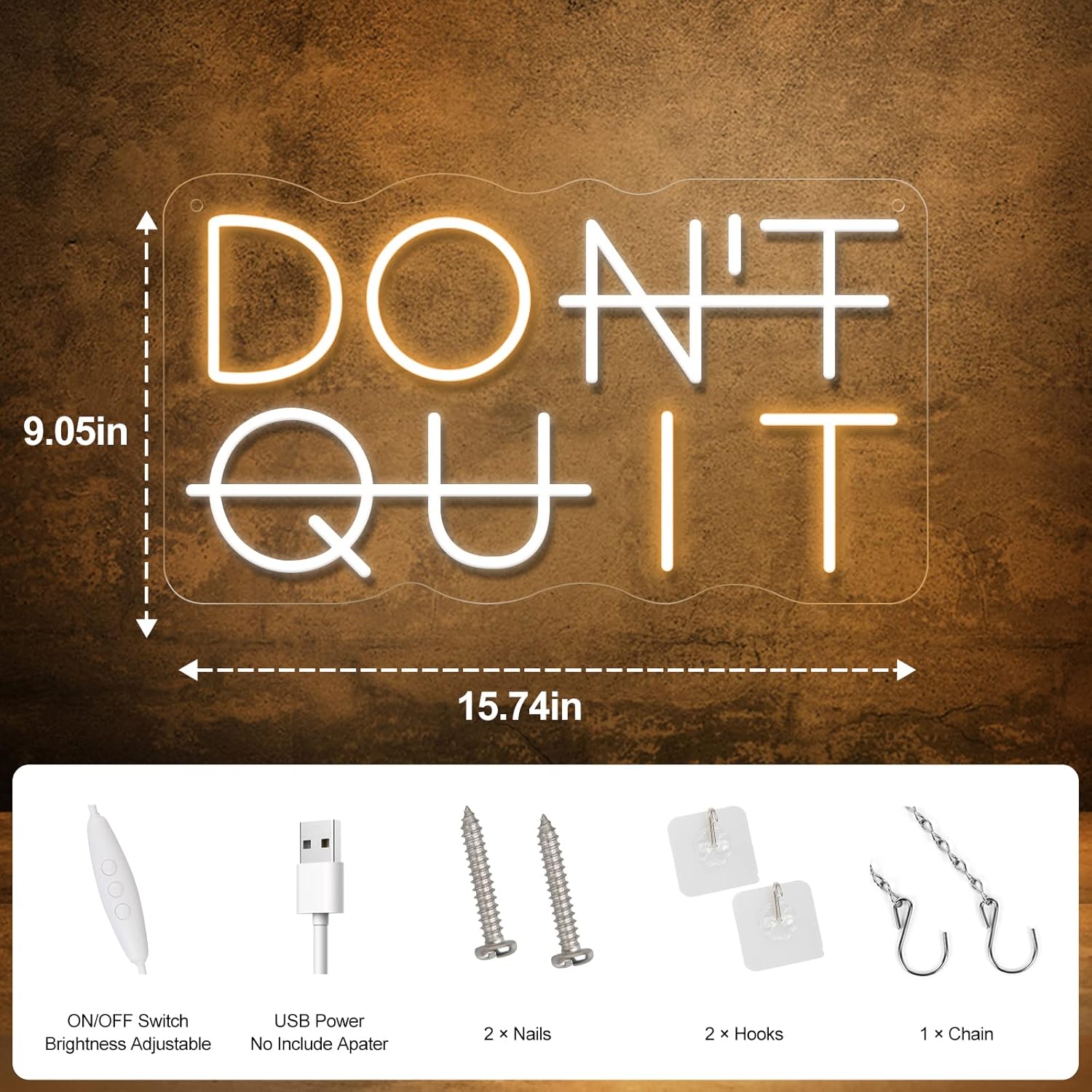 - Style & Material: The sign of Don't Quit (it also means to DO IT, don't give up)neon light is an exquisite artistic neon light decor sign. The LED neon light's combination of yellow and white is novel. The Neon Signs are made of Acrylic LED, Silicon Strips, and ABS Material, with No risk of glass breakage or leakage of hazardous materials