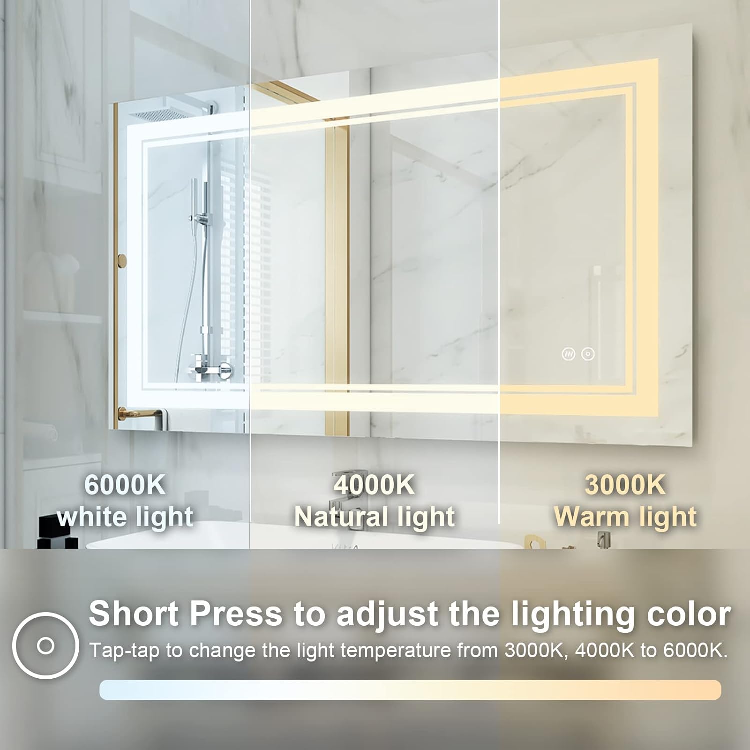 - Dimmable: Our smart vanity mirrors can adjust the color (warm, natural and white) and brightness (100%-10%) of the lights. Not only that, the lighted bathroom mirror also has a memory function. The next time you turn it on, it will keep the light color and brightness that suits you best. Perfect for hotels, high-end salons or bedrooms and bathrooms at home.