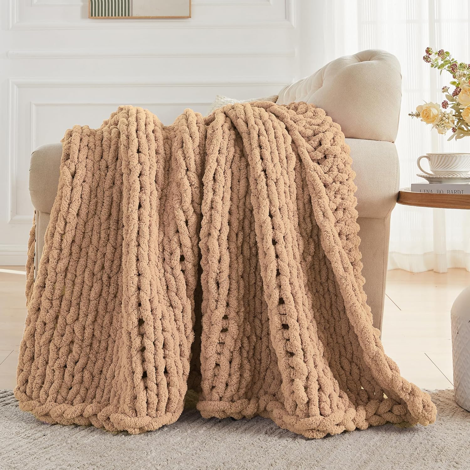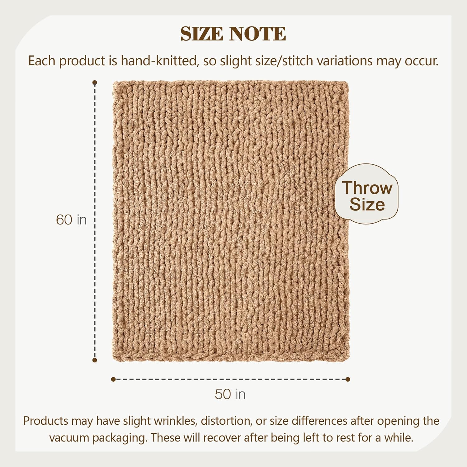 Carriediosa Chunky Knit Throw Blanket 50" X 60", 100% Hand Made Large Chenille Loop Yarn Soft Fluffy Throws for Couch Sofa Bed, Big Crochet Cozy Heavy Thick Cable Woven Blankets, Tan Brown
