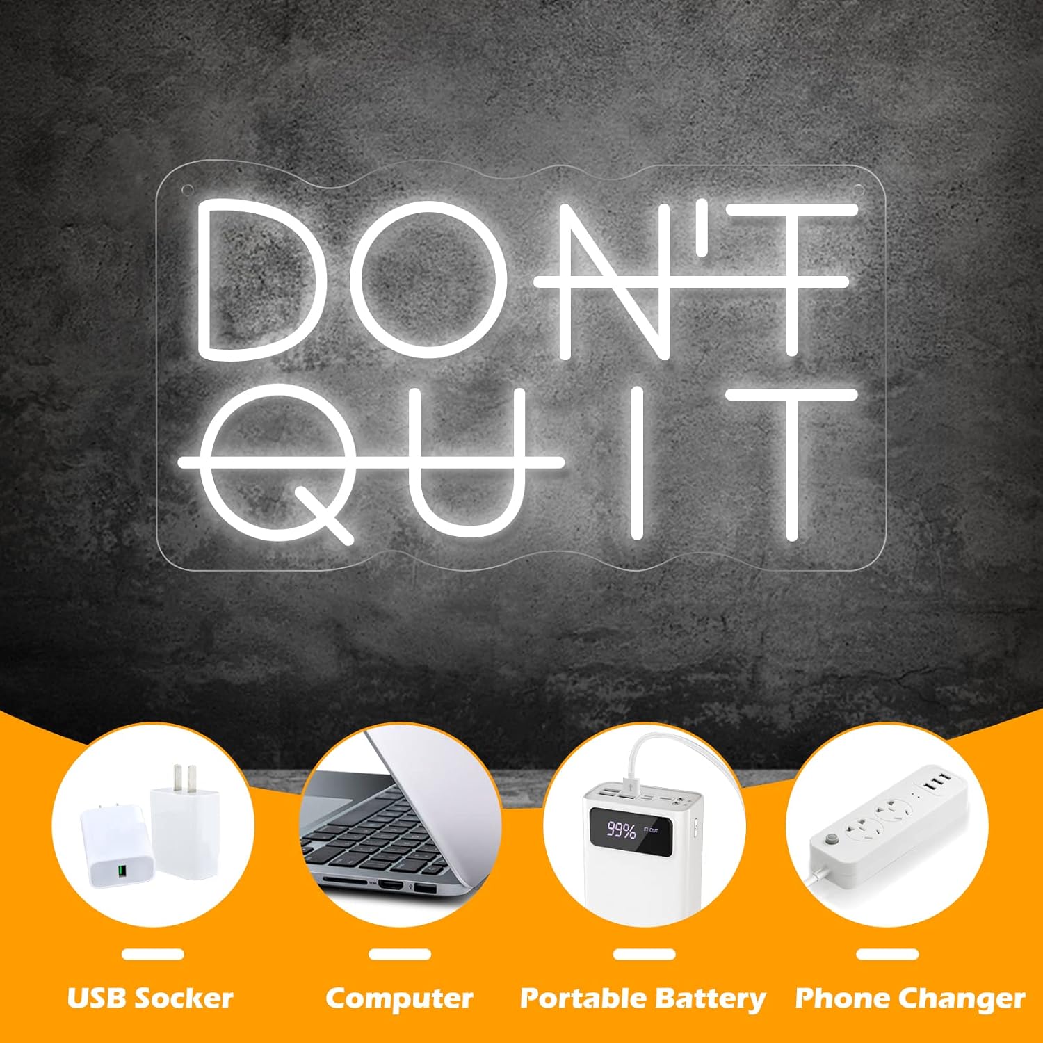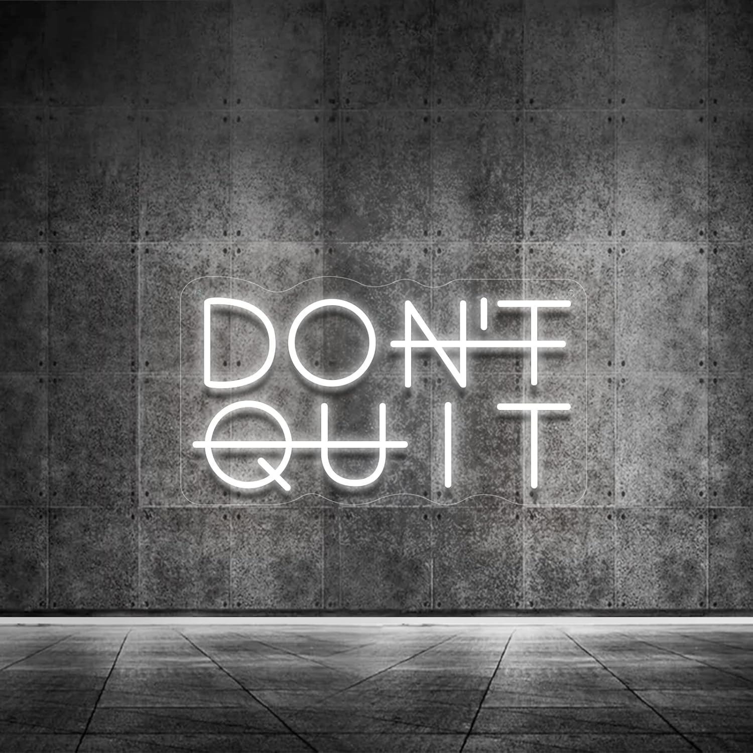 - Style & Material: The sign of Don't Quit (it also means to DO IT, don't give up)neon light is an exquisite artistic neon light decor sign. The LED neon light's combination of white is novel. The Neon Signs are made of Acrylic LED, Silicon Strips, and ABS Material, with No risk of glass breakage or leakage of hazardous materials