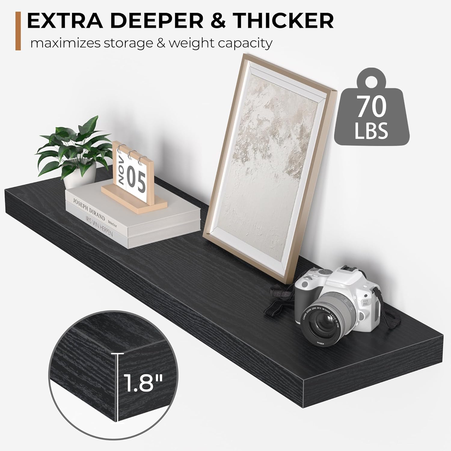 - Extra Deeper & Thicker - This wall shelf measures 36"W x 10.23"D x 1.8"H. Extra deeper and thicker design in order to bring maximizes storage space and weight capacity, even hold up to 70 lb. This floating shelf taking up zero square feet, reduces clutter and highlights dƩcor in compact spaces.