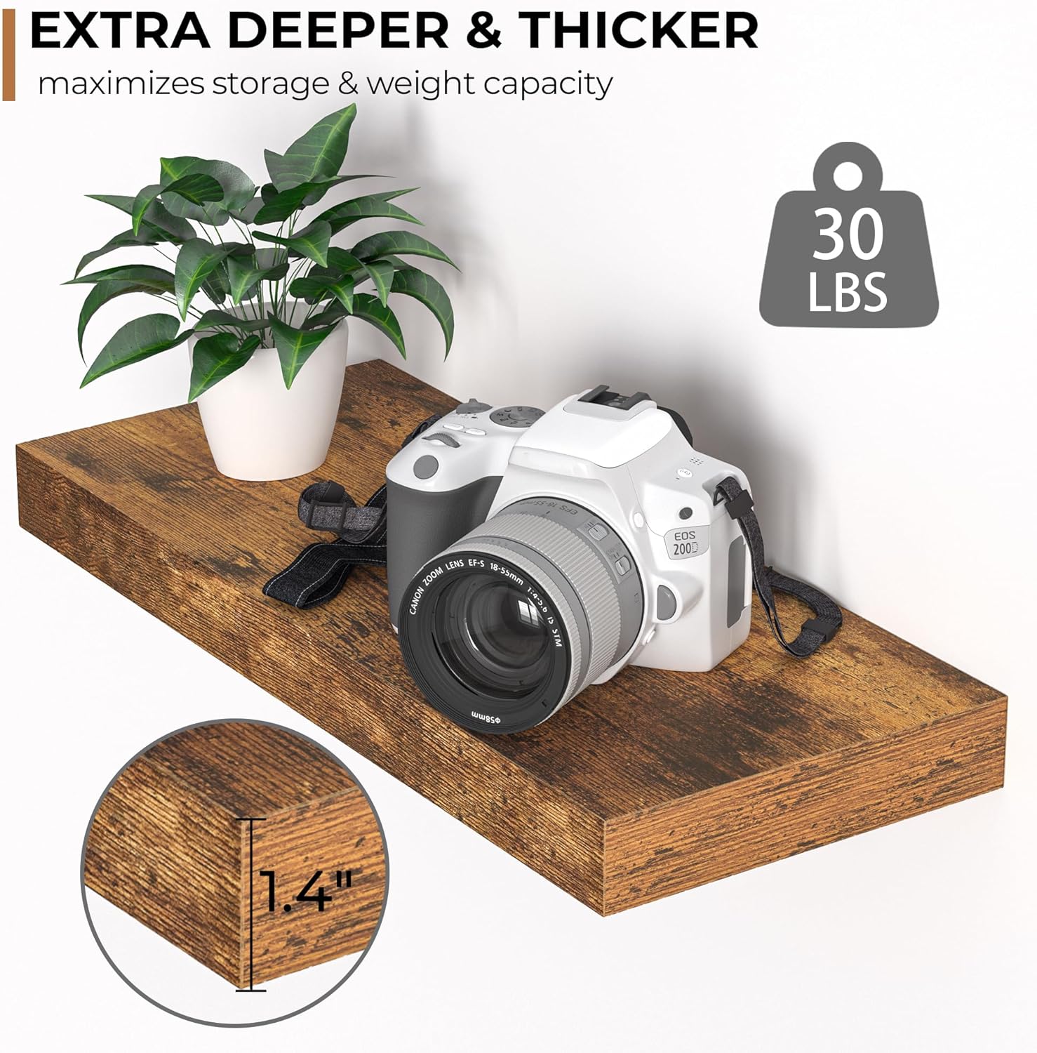- Extra Deeper & Thicker - Each board measures 16"W x 6.7"D x 1.4"H. Extra deeper and thicker design in order to bring maximizes storage space and weight capacity, even hold up to 30 lb each. This floating shelf taking up zero square feet, reduces clutter and highlights dƩcor in compact spaces.