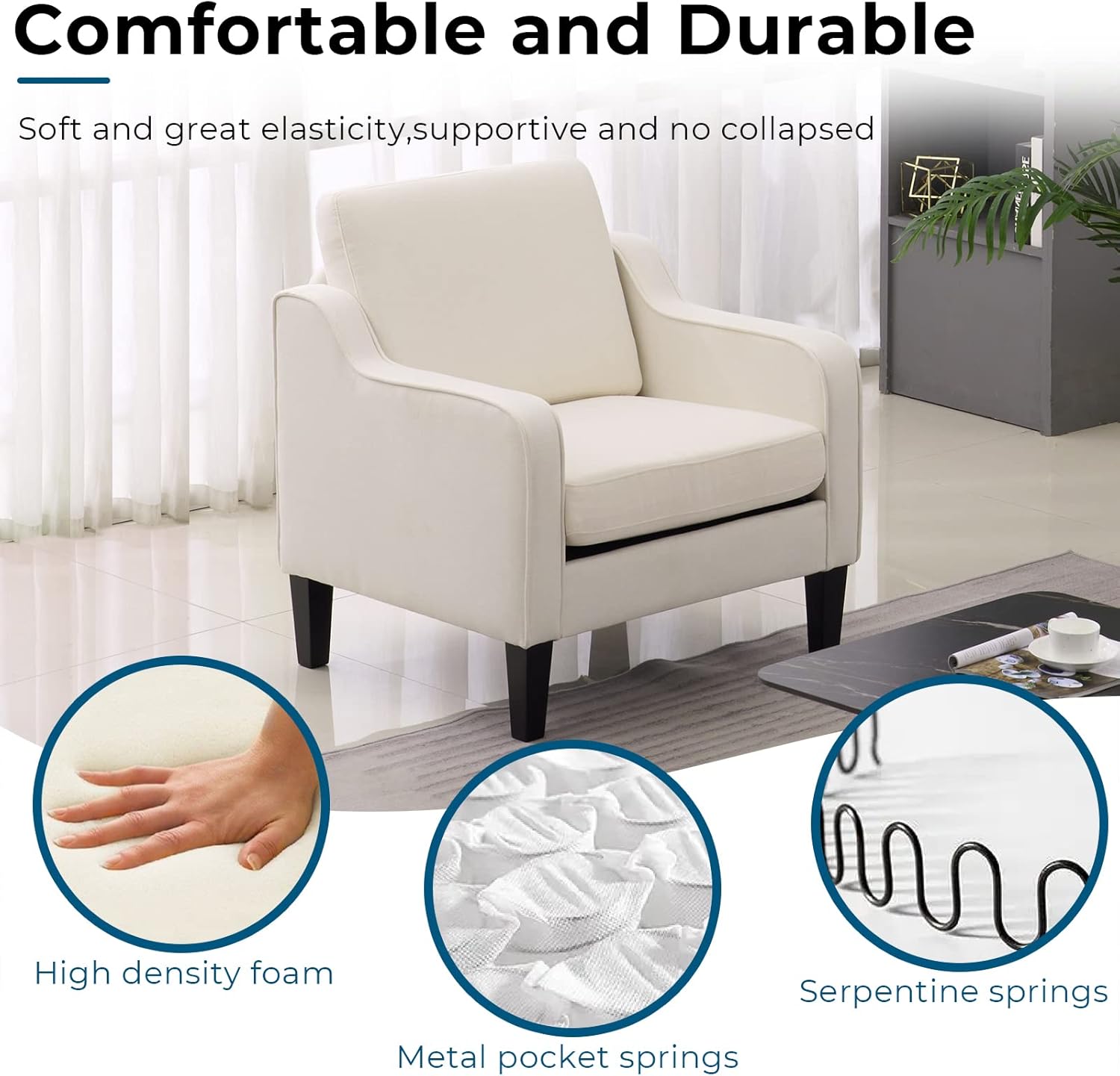- Comfort?Relax and Enjoy:Stuffed with plush,high-desity foam and steel springs making our beige sofa chair offer high levels of comfort and allow for great relaxation.Reading chair?TV chair?Guest chair?It can well serve its purpose creating a cosy corner for your social events or personal time,it's comfortable to sit but you don't sink into it,still easy to get up.