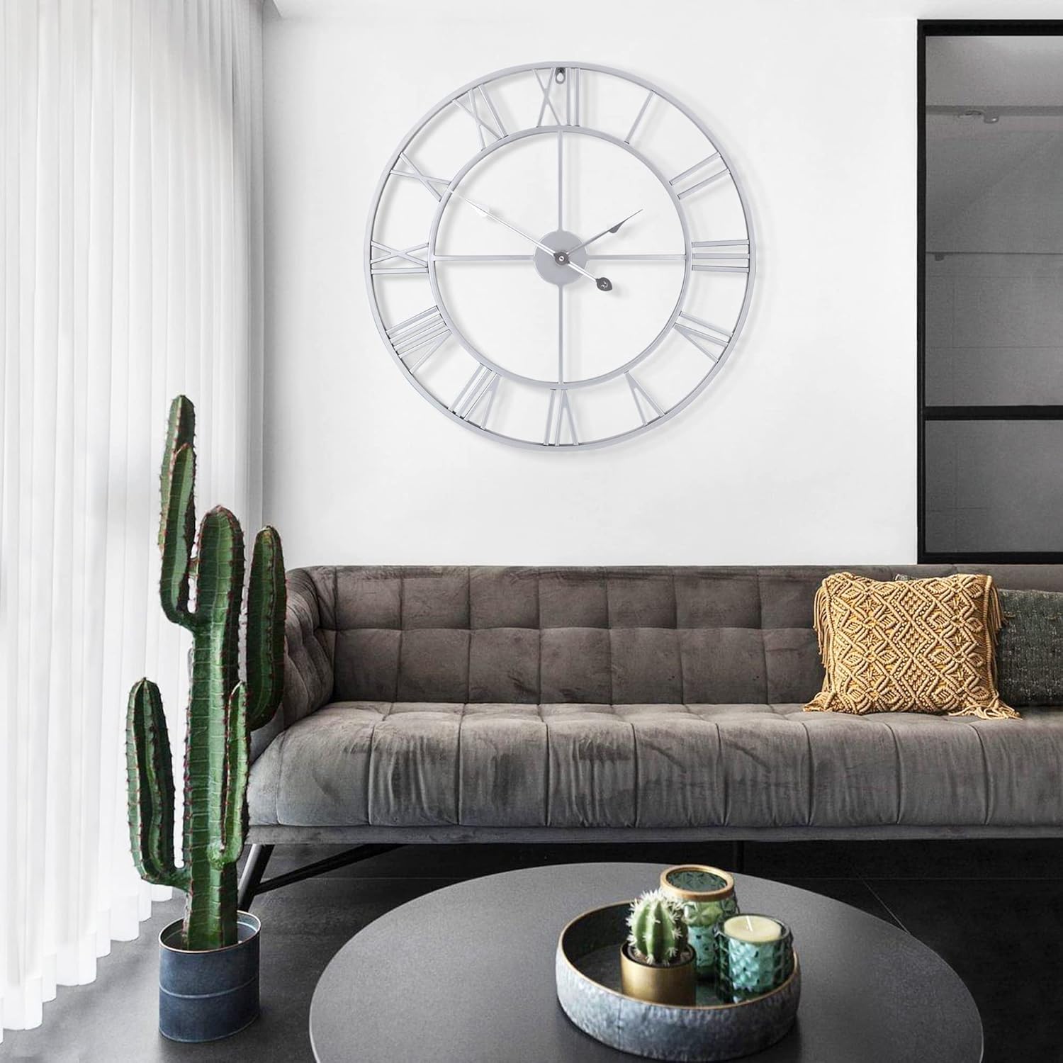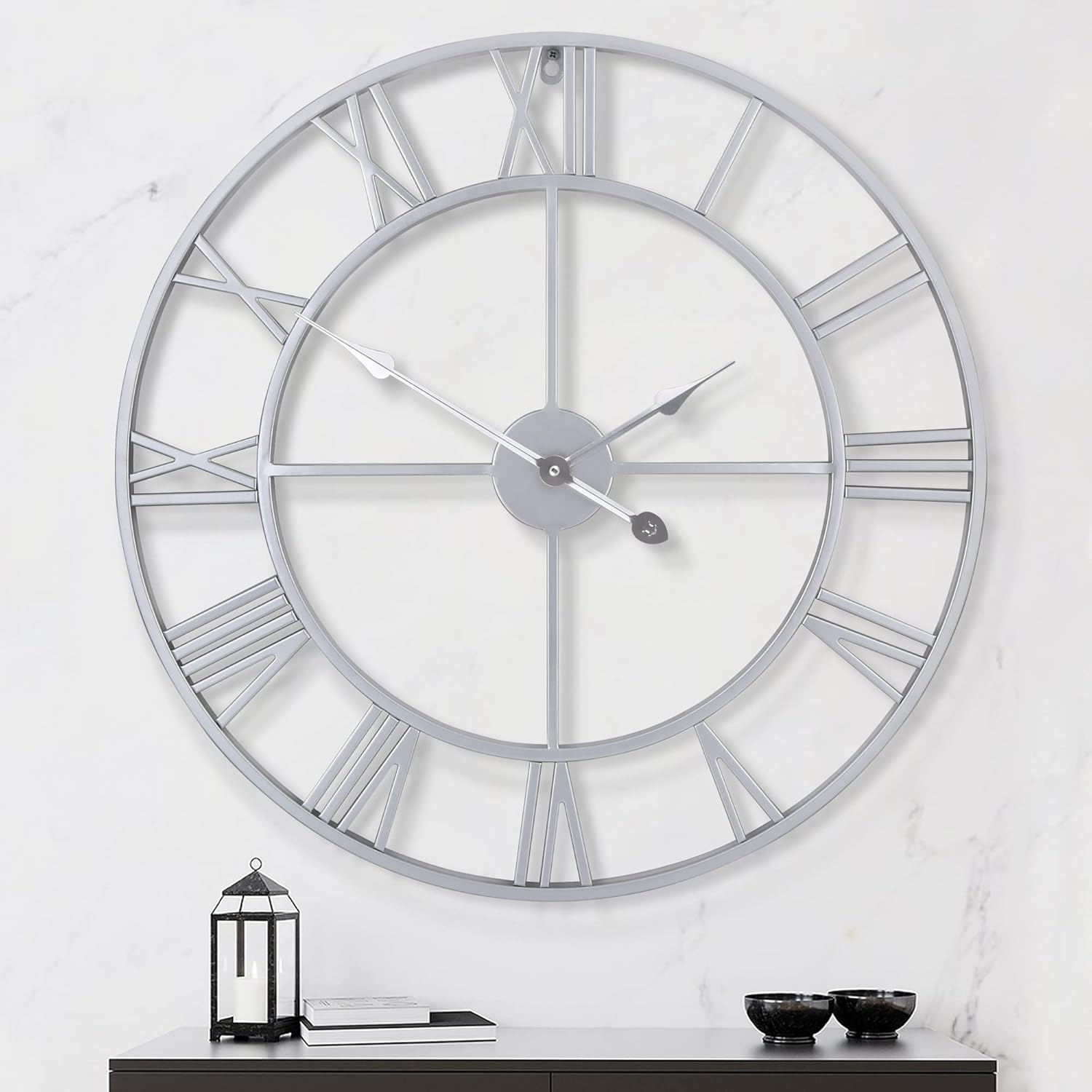 LEIKE 32" Large Modern Wall Clocks,Vintage,Round,Nearly Silent,Little Ticking,Battery Operated,Silver Metal Roman Numerals Clock for Living Room/Bedroom/Kitchen Wall Decor