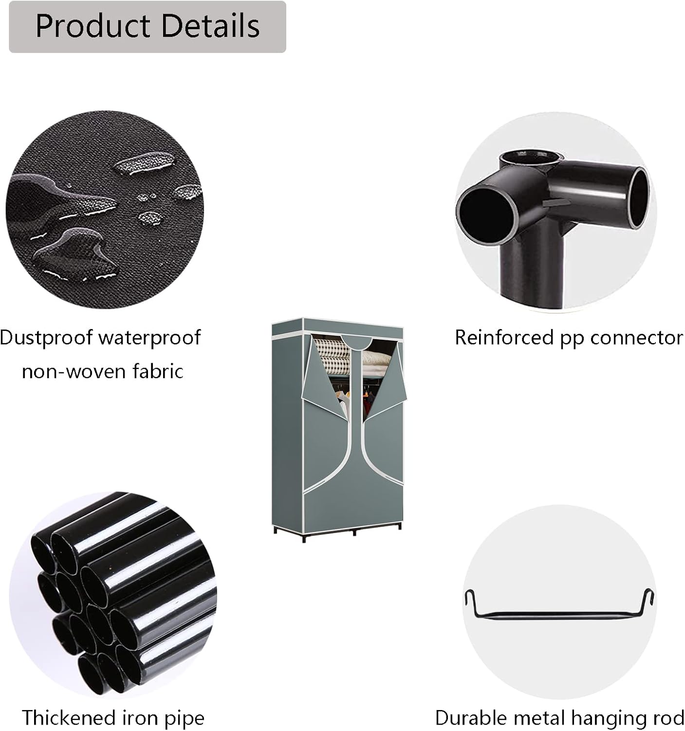 SORCEDAS Portable Wardrobe Closet Storage Organizer Metal Hanging Rack Non-Woven Fabric 34 Inch Grey