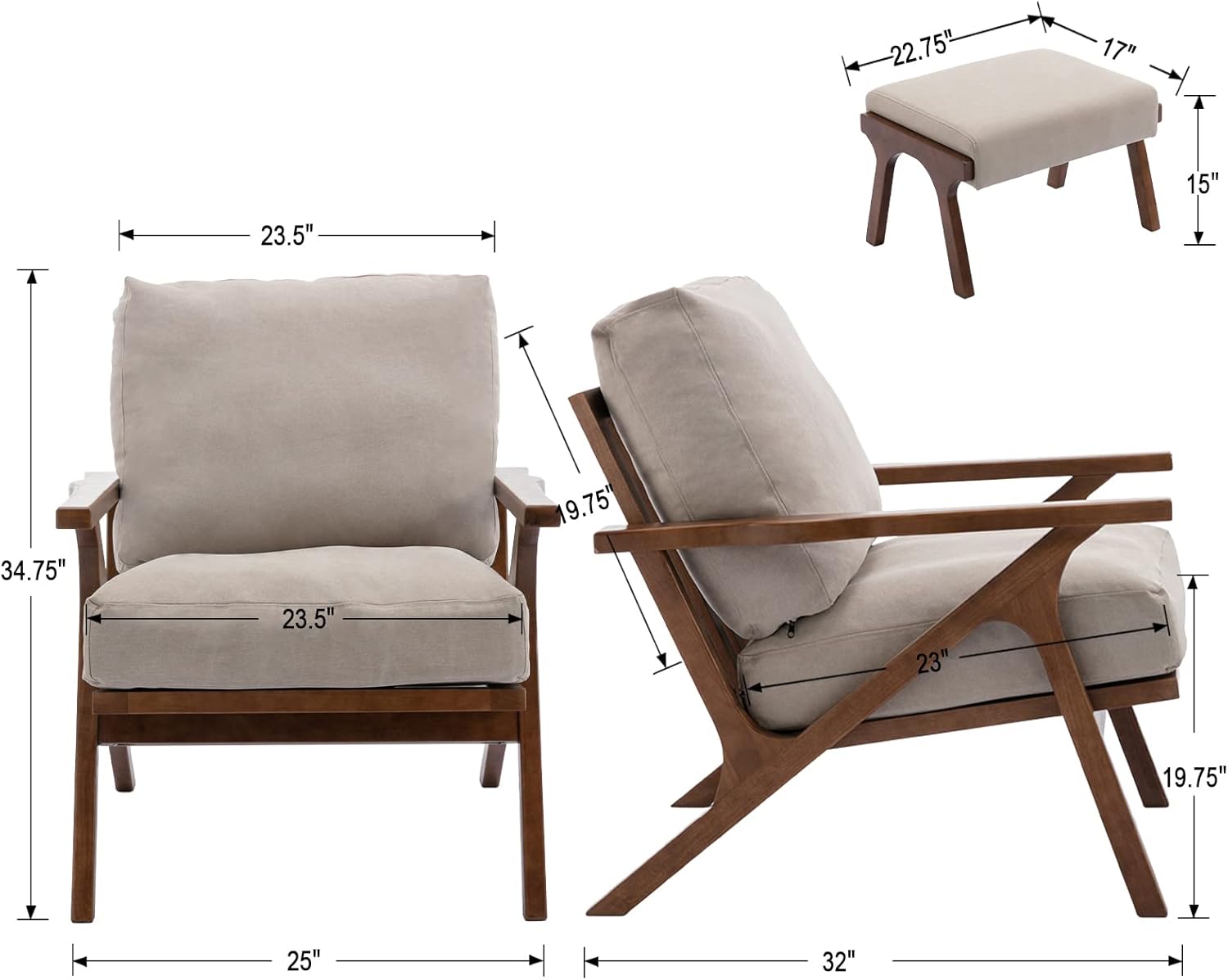 Mid Century Modern Accent Chair with Ottoman, Farmhouse Linen Upholstered Living Room Armchair and Ottoman Set, 23" Seat Wide Retro Leisure Lounge Chair with Wood Frame for Home, Bedroom, Beige