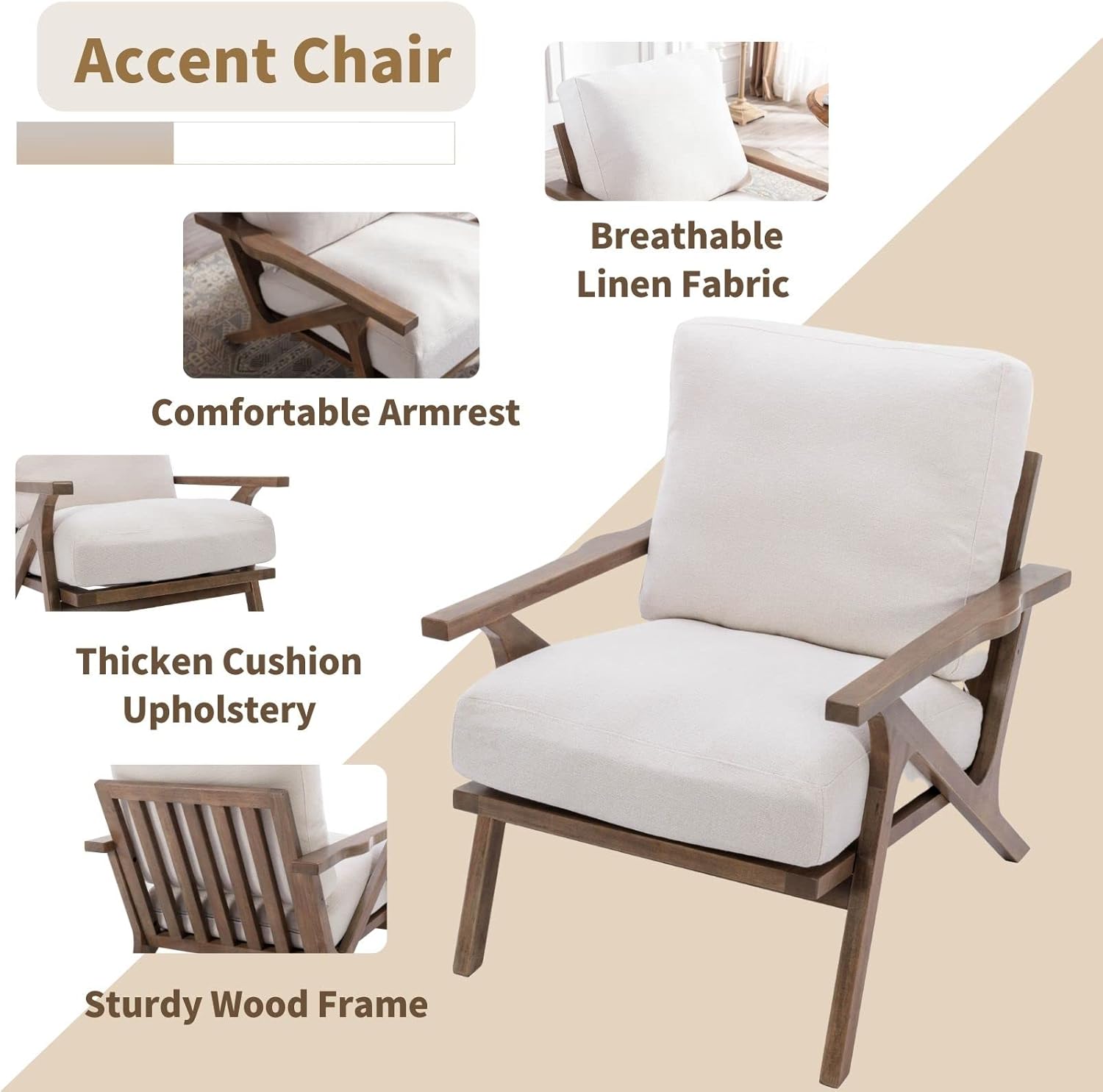 Mid Century Modern Accent Chair with Ottoman, Farmhouse Linen Upholstered Living Room Armchair and Ottoman Set, 23" Seat Wide Retro Leisure Lounge Chair with Wood Frame for Home, Bedroom, White
