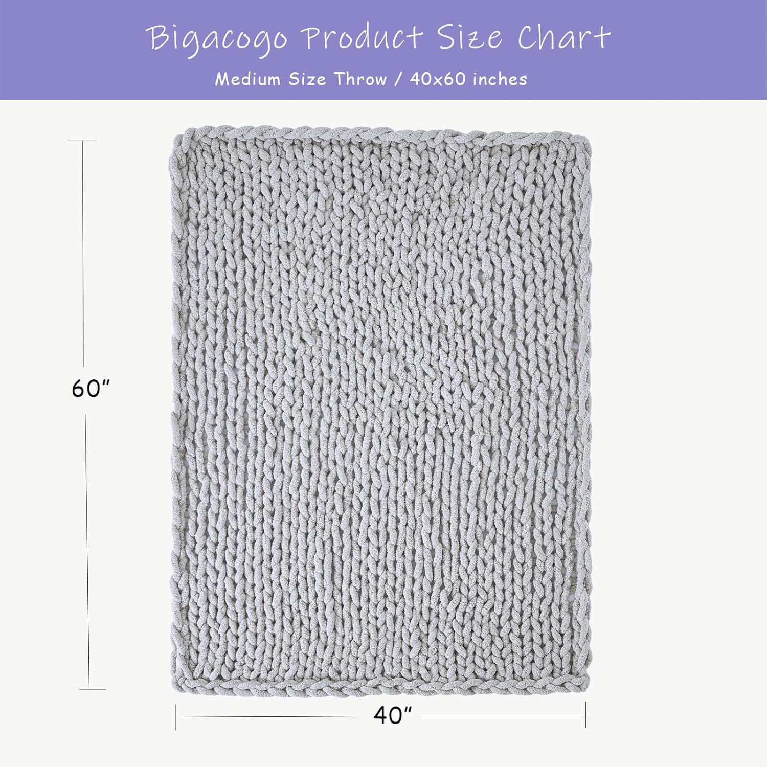 Bigacogo Chunky Knit Throw Blanket for Couch, 40x60 inches, 100% Hand Knitted with Thick Jumbo Chenille Yarn, Cozy Soft Large Rope Knot Cable Crochet Blankets for Sofa Bed Living Room, Light Grey