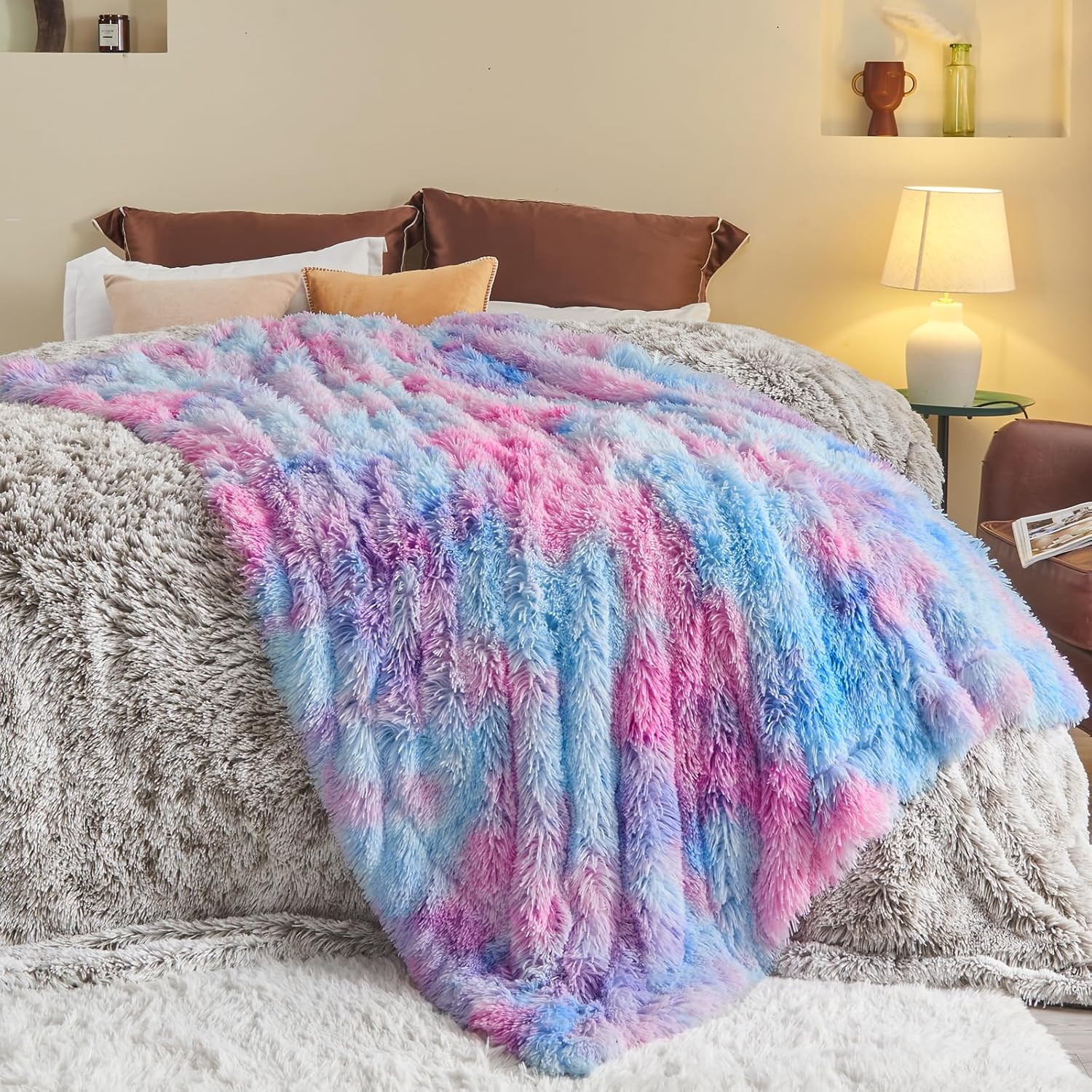- Elegant & Cozy: Diverse patterns including tie dye, solid colors, dots and stripes and 1.5 inches of soft faux fur enhance the classy appearance of the blanket to complement the chic feeling of your room. Bring you all year round coziness and elegance.