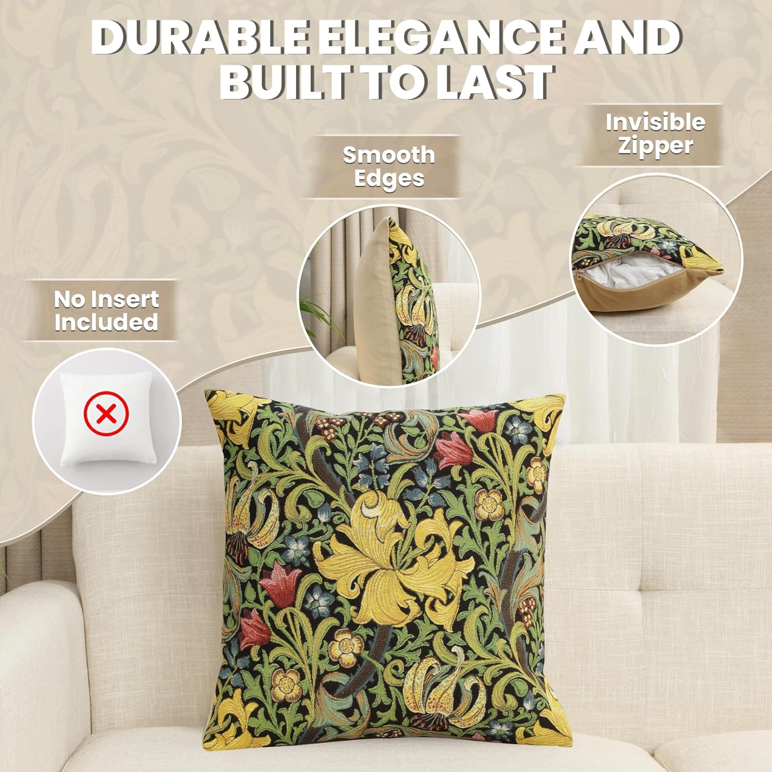 - Exclusive Design Excellence: The decorative pillow covers are made of high-quality jacquard woven fabric, 100% cotton for extreme comfort and durability. The designs of these William Morris pillow covers are woven with precision using the most vibrant colors. The zippers are hidden and overlock stitch seams create an appearance of sophistication while providing durability for any home decor