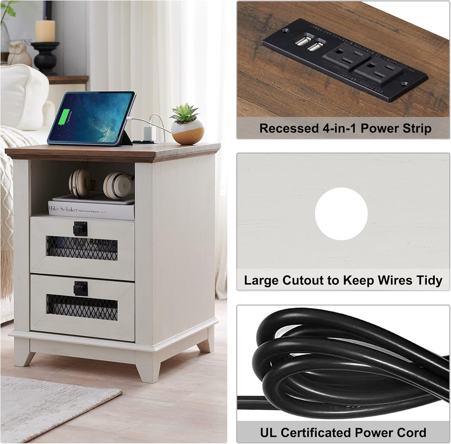 - CHIC & PRACTICAL: Size: 18" W × 18" D × 24"H. Its farmhouse style attention with a distressed rustic finish and dark iron-tone metal accents. You'll love the extra room in the cubby and 2 drawers for stashing items within arm's length. Moreover, a convenient UL-listed AC power supply with 2 AC outlets and 2 USB ports at the tabletop is perfect for keeping your electronics charged without getting up from your seat/bed. Upper open cubby with 2.3'' cord management port to keep your cables organized