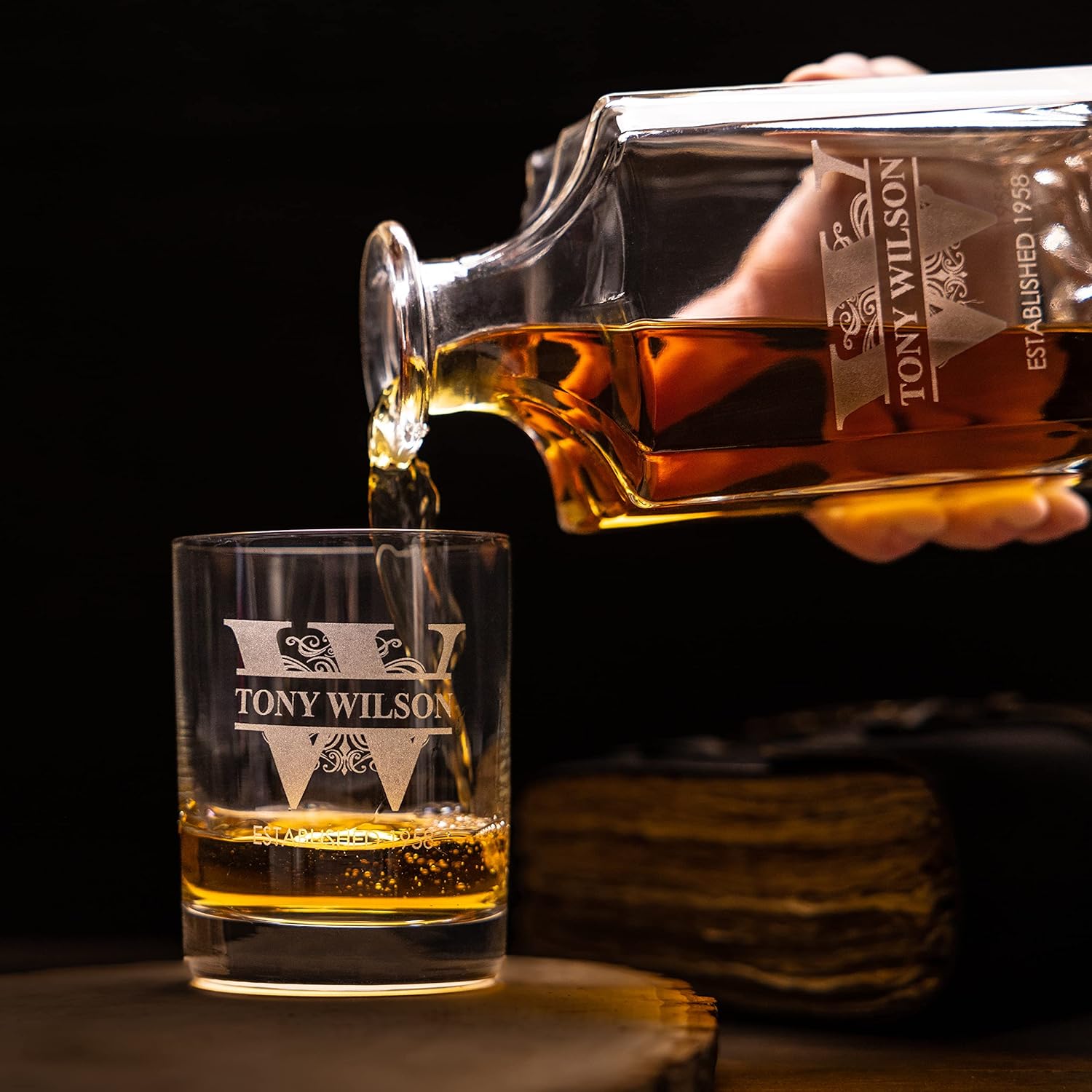 - CUSTOMIZE - laser engraved etching. Select your design and personalize your name, initial, & date to create a one of a kind whiskey gift set. The engraving is permanent and the glasses & decanter are dishwasher safe