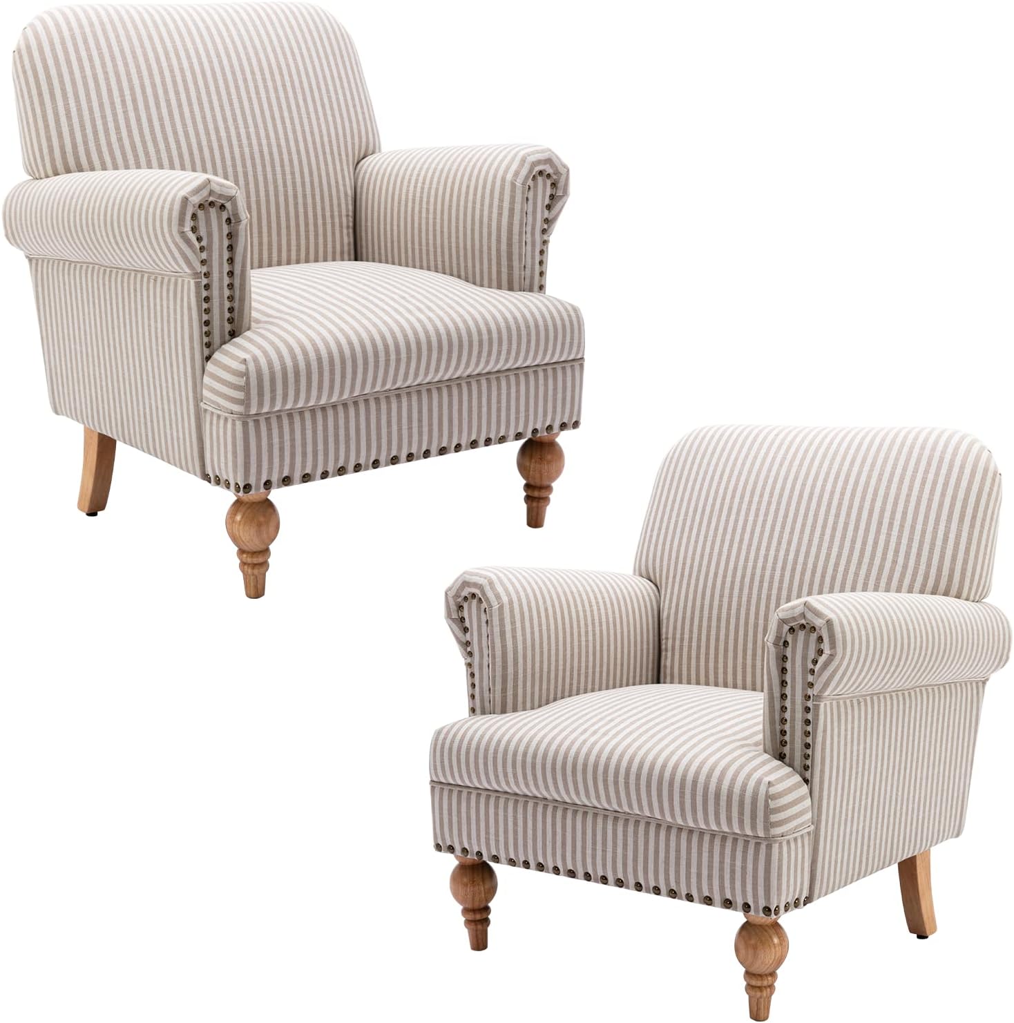 chairus Linen Accent Chair for Living Room Set of 2 Upholstered Mid Century Modern Single Sofa Chair with Solid Wood Legs Comfy Reading Chair Armchair for Bedroom/Office/Recption/Lounge, Khaki Stripe