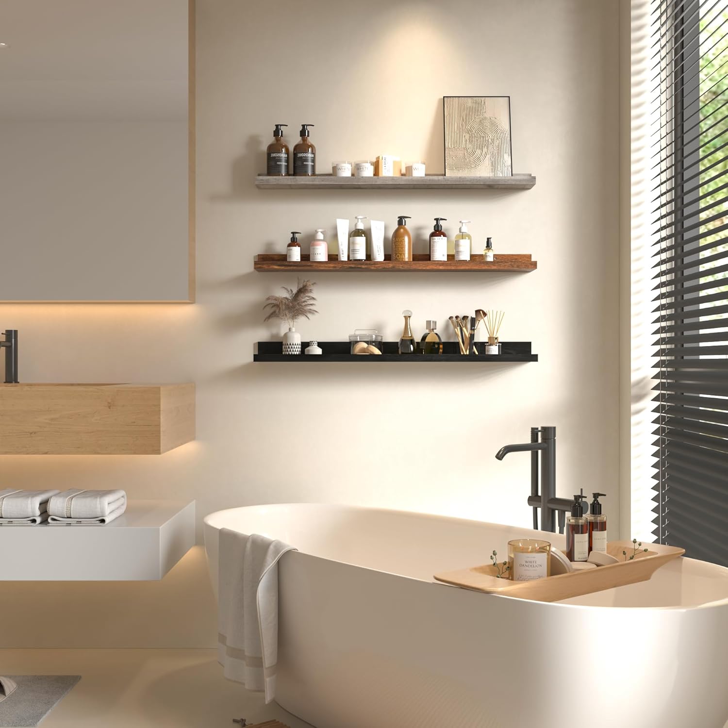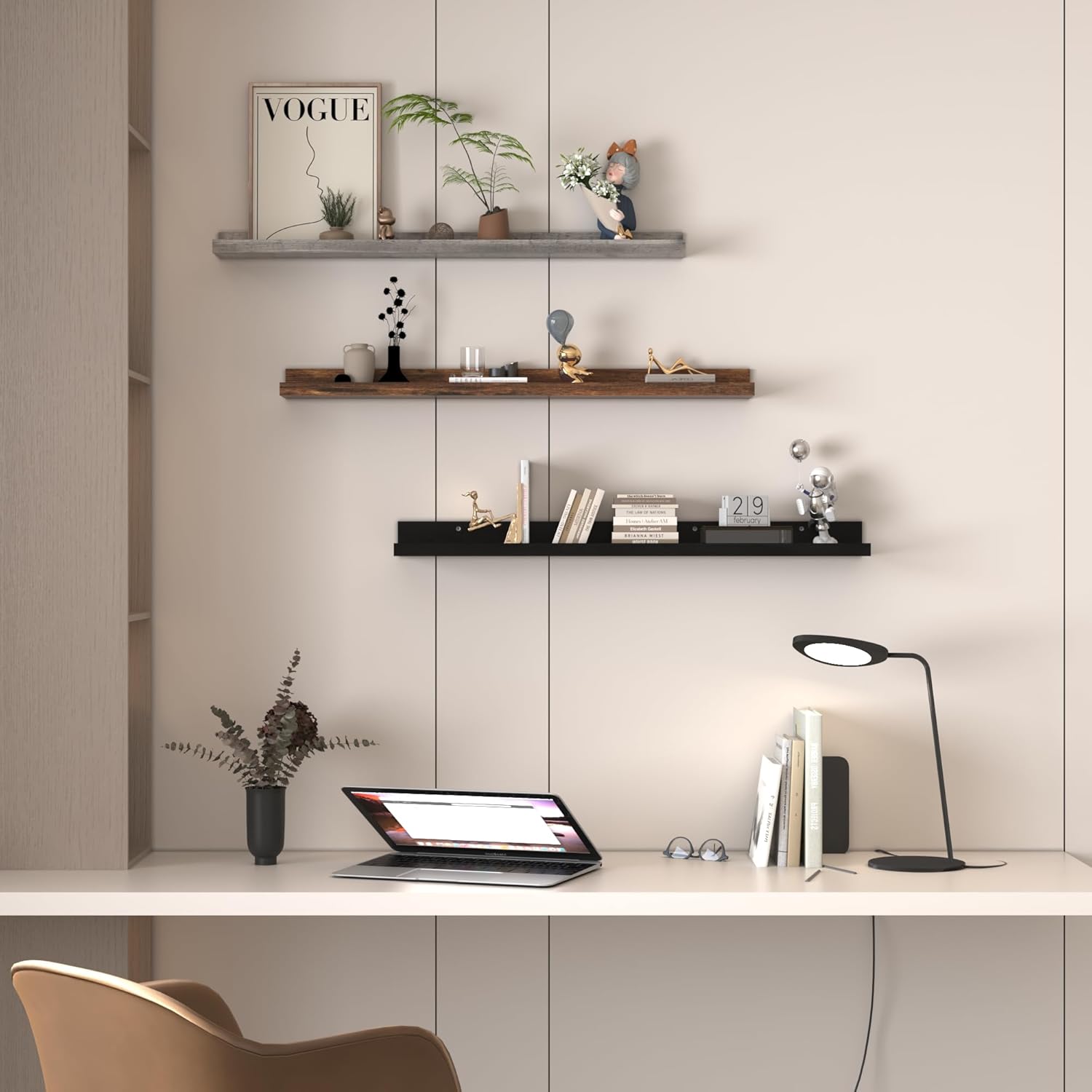 - Colorful wooden shelves Set: 3 colors included: black, brown, and grey. The 3 mixed colors wall-mounted shelves set blends perfectly into any space, not only as a wall storage tool, but also as a wall decoration.