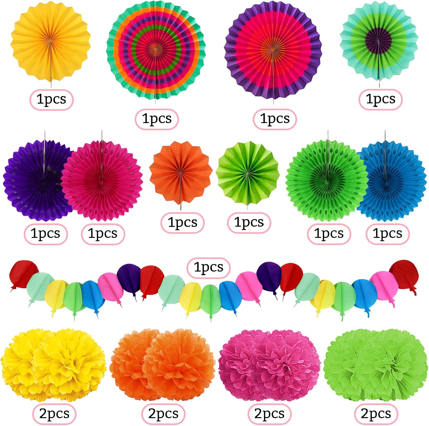 - Included Components : Paper Fans, Paper Pompoms, Paper Hollow Fans, Paper Hot Air Balloon Garland