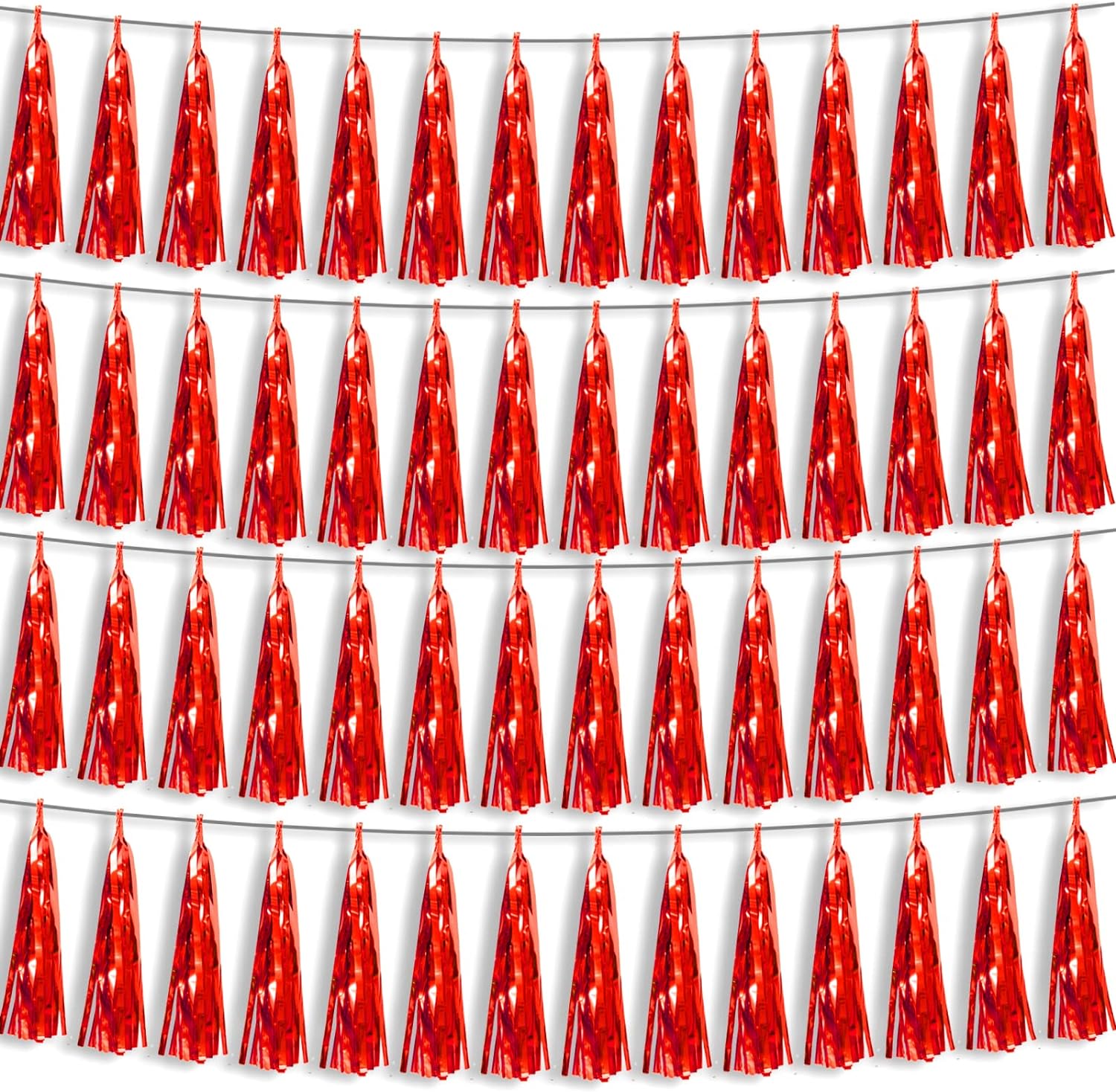 4P Red Foil Fringe Metallic Tassel Streamers Banner Tassel Garland for Parade Floats, Bachelorette, Wedding, Birthday, Halloween, Christmas, Bridal/Baby Shower Party Decorations