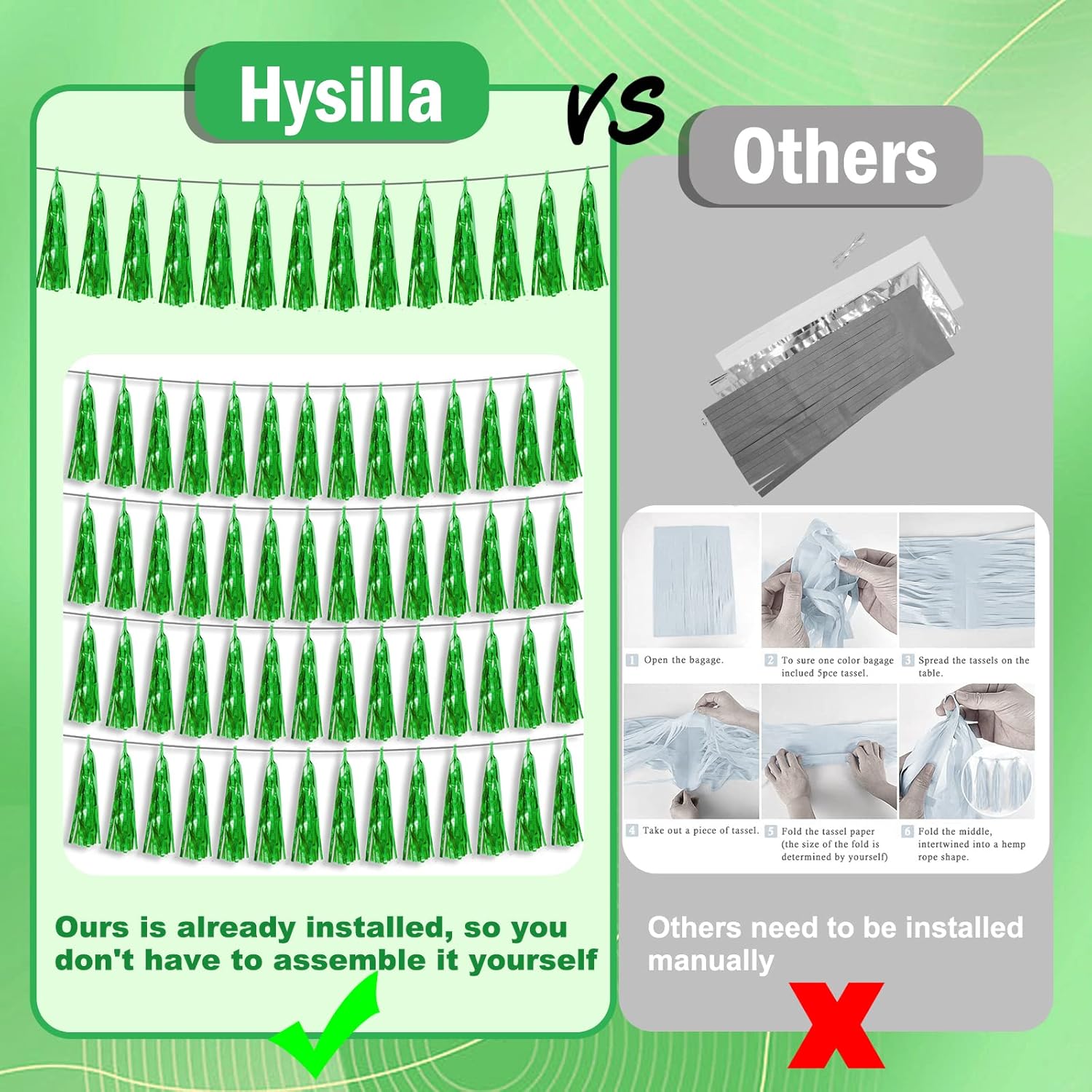 - 【Green Party Supplies Set】: The total length of the green birthday tassels banner is 26.2 feet, divided into 4 strips, each 6.5 feet long. Each banner contains 15 tassels, and each tassel measures 14 inches, for birthday decorations many occasions, and so on