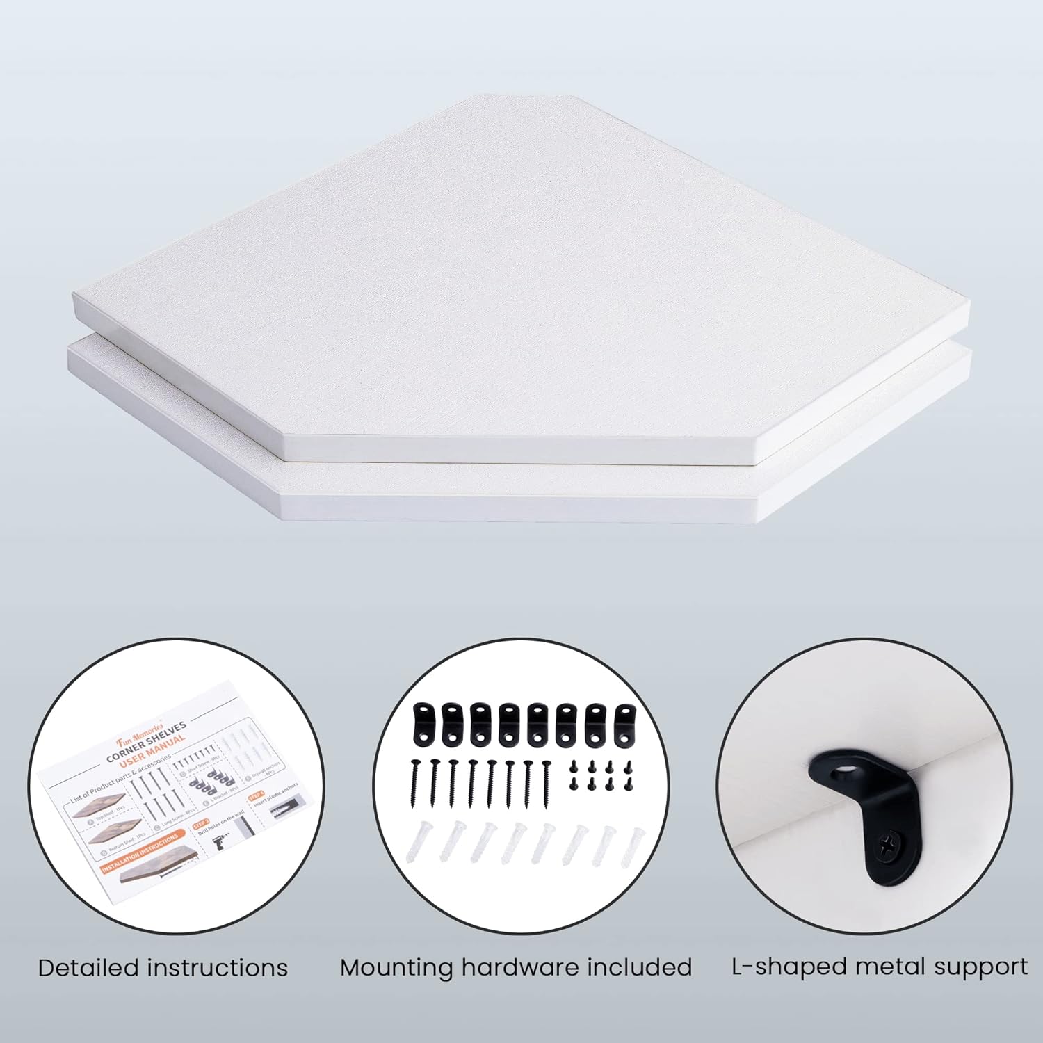- ăEasy to MountăThe package comes with user-friendly instructions and all the necessary mounting hardware. Just place the corner wall shelf level in your desired location and secure it in place using the hidden bracket connectors provided, followed by screws