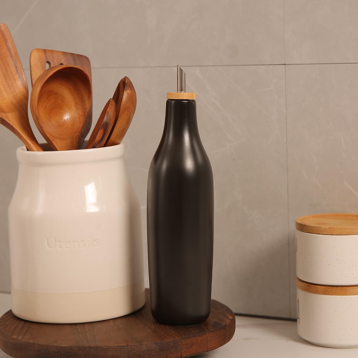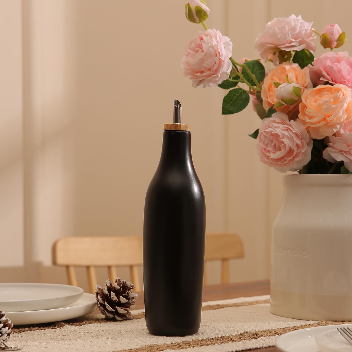 • KITCHEN BOTTLE DISPENSER - 16.9 fluid ounce (500 ml) Ceramic oil dispenser bottle or vinegar dispenser bottle with bamboo cap and stainless steel cruet spout, Works great as a kitchen dispenser for Olive Oil, Vinegar, syrups and more.