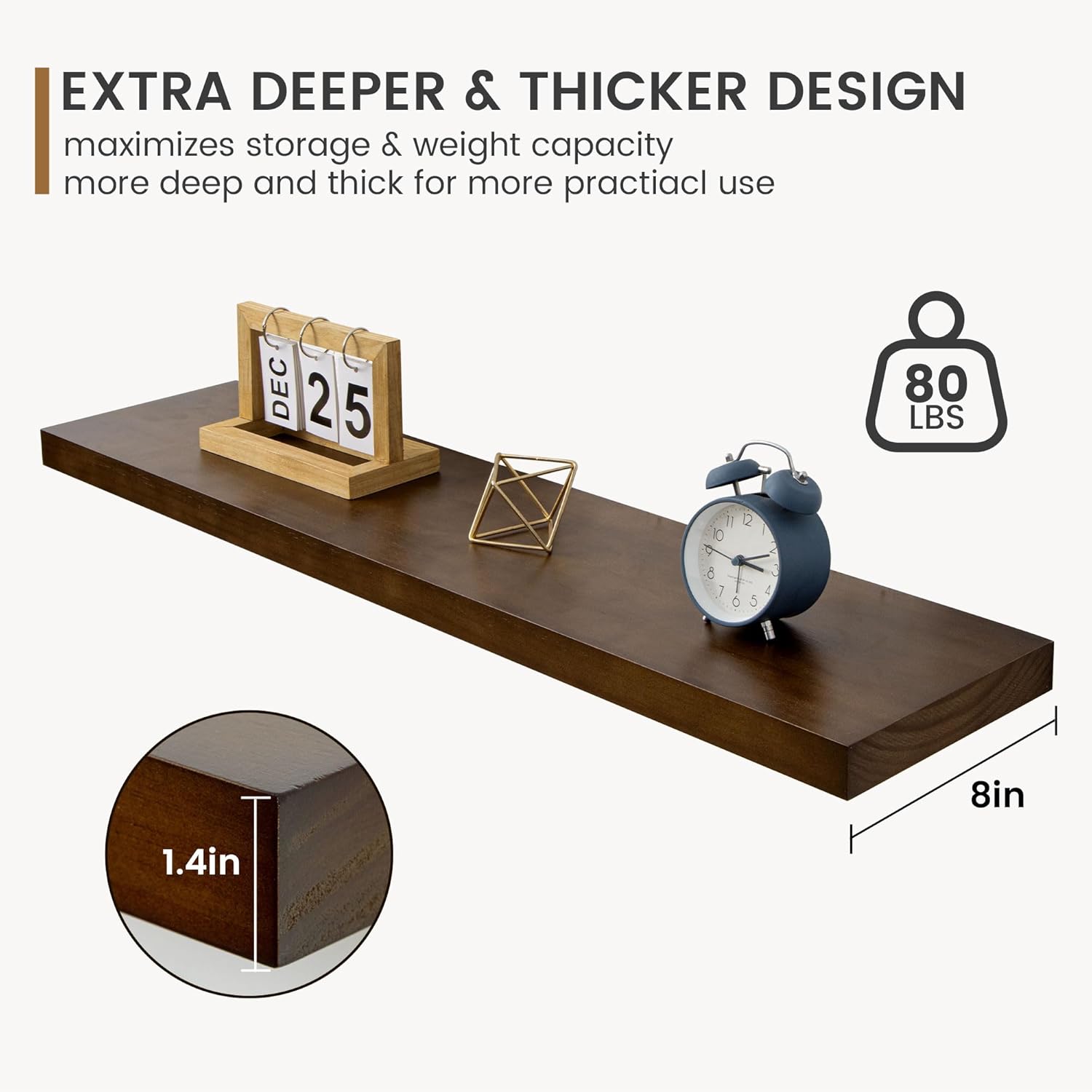 - Extra Deeper & Thicker for Storage - Each board measures 36"W x 8"D x 1.4"H. Extra deeper and thicker design in order to bring maximizes storage space and weight capacity, even hold up to 60 lb. This floating shelf taking up zero square feet, reduces clutter and highlights dƩcor in compact spaces. It can help make full use of the empty wall, making it much more space-saving and making your room look larger and tidier.