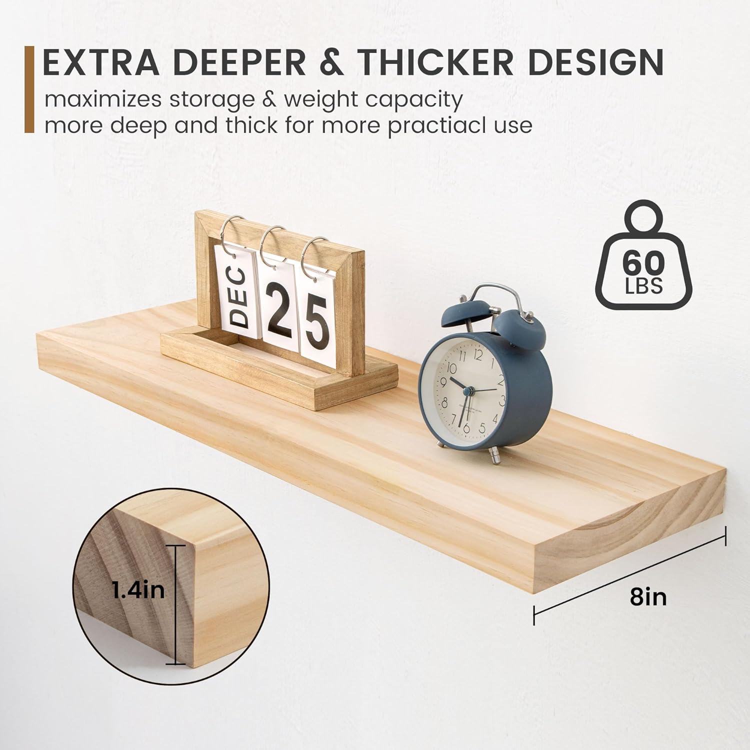 - Extra Deeper & Thicker for Storage - Each board measures 24"W x 8"D x 1.4"H. Extra deeper and thicker design in order to bring maximizes storage space and weight capacity, even hold up to 60 lb. This floating shelf taking up zero square feet, reduces clutter and highlights dƩcor in compact spaces. It can help make full use of the empty wall, making it much more space-saving and making your room look larger and tidier.