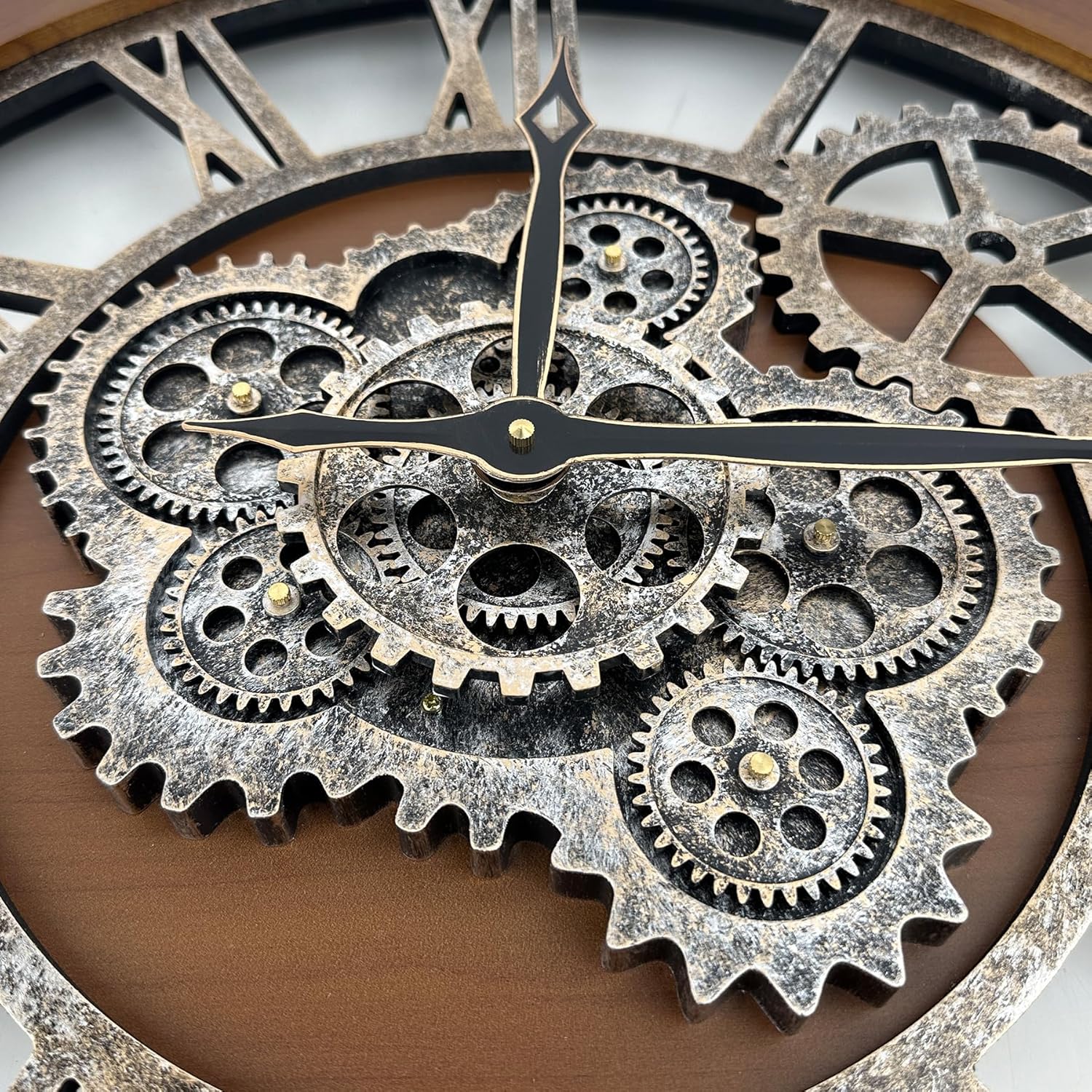 - ăReal Moving Gear ClockăAll gears for the wall clock are real moving! Design with rustic bronze-color and industrial style. An creative combination of four gears for a retro look, has a very exquisite decorative effect makes the wall clock become a chic art works. The large wall clock crafted of nature wood & MDF. Big roman numeral numbers and wood rustic moving gears perfect for any room decor.