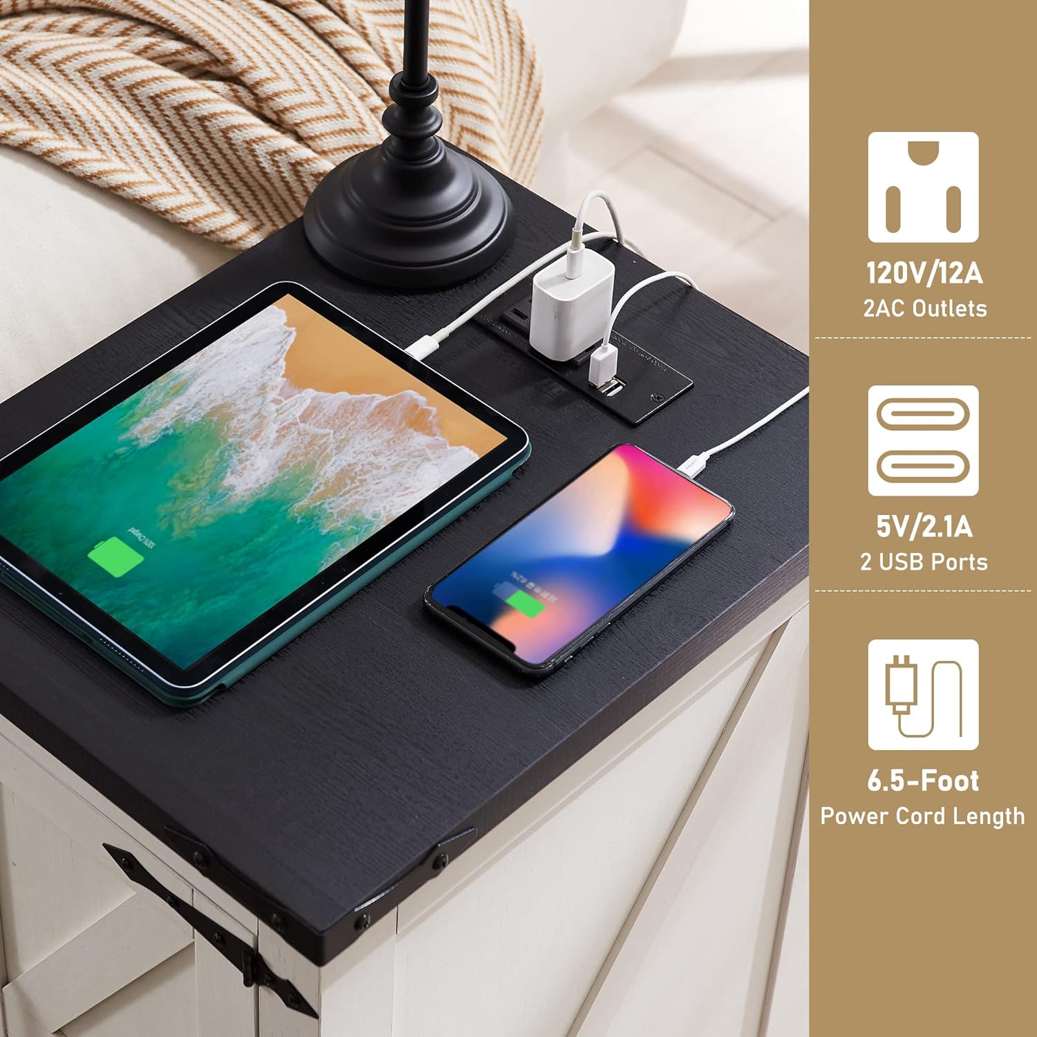 - CHARGING STATION TABLE: This end table with charging station is equipped with 2 Standard AC Outlets and 2 USB ports, with two 2.3"round holes at the back for organizing the cords, which makes the desk neater while providing convenience for charging your devices such as cell phones, tablets, and earphones. A great addition to your home, making your house more orderly