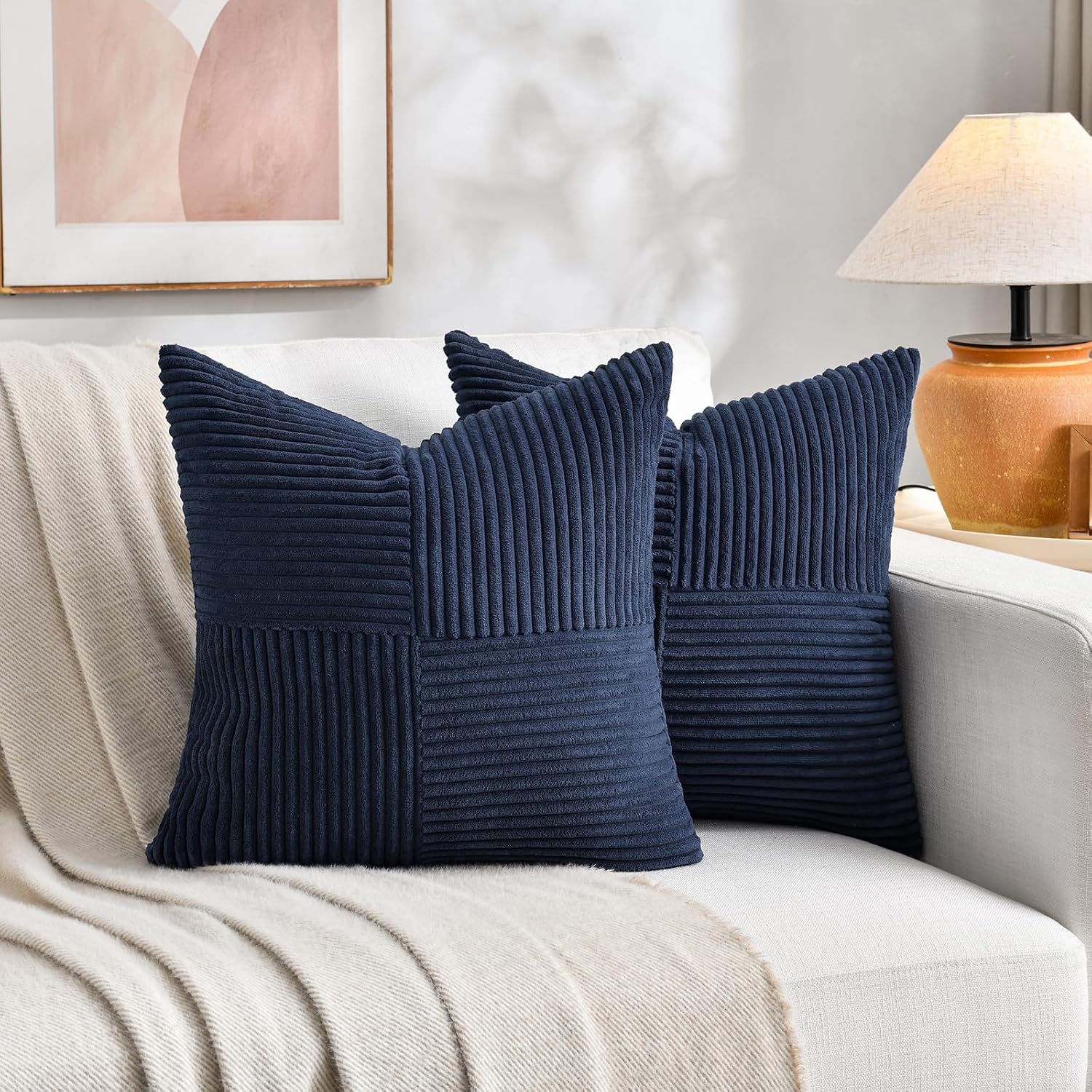 Fancy Homi 2 Packs Navy Blue Samll Decorative Throw Pillow Covers 12x12 Inch with for Couch Bed Sofa, Rustic Farmhouse Boho Home Decor, Soft Corss Patchwork Corduroy Square Cushion Case 30x30 cm