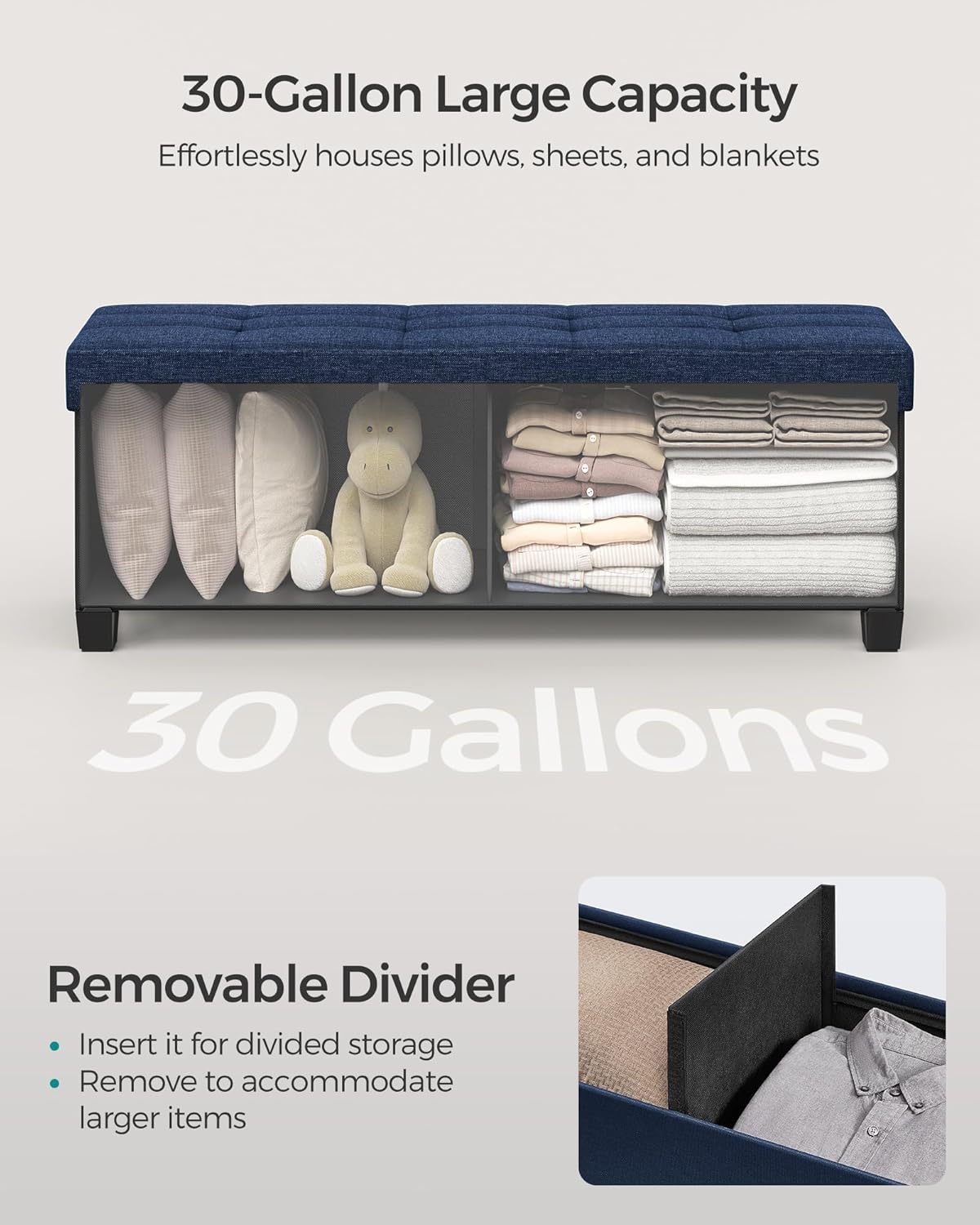 - ăSPACIOUS STORAGEăSized at 15"D x 43"W x 15.7"H (38 x 110 x 40 cm), this end of bed bench offers a 30-gallon (112 L) volume for your blankets, books, and bed sheets. A removable divider is included to keep you items neatly sorted