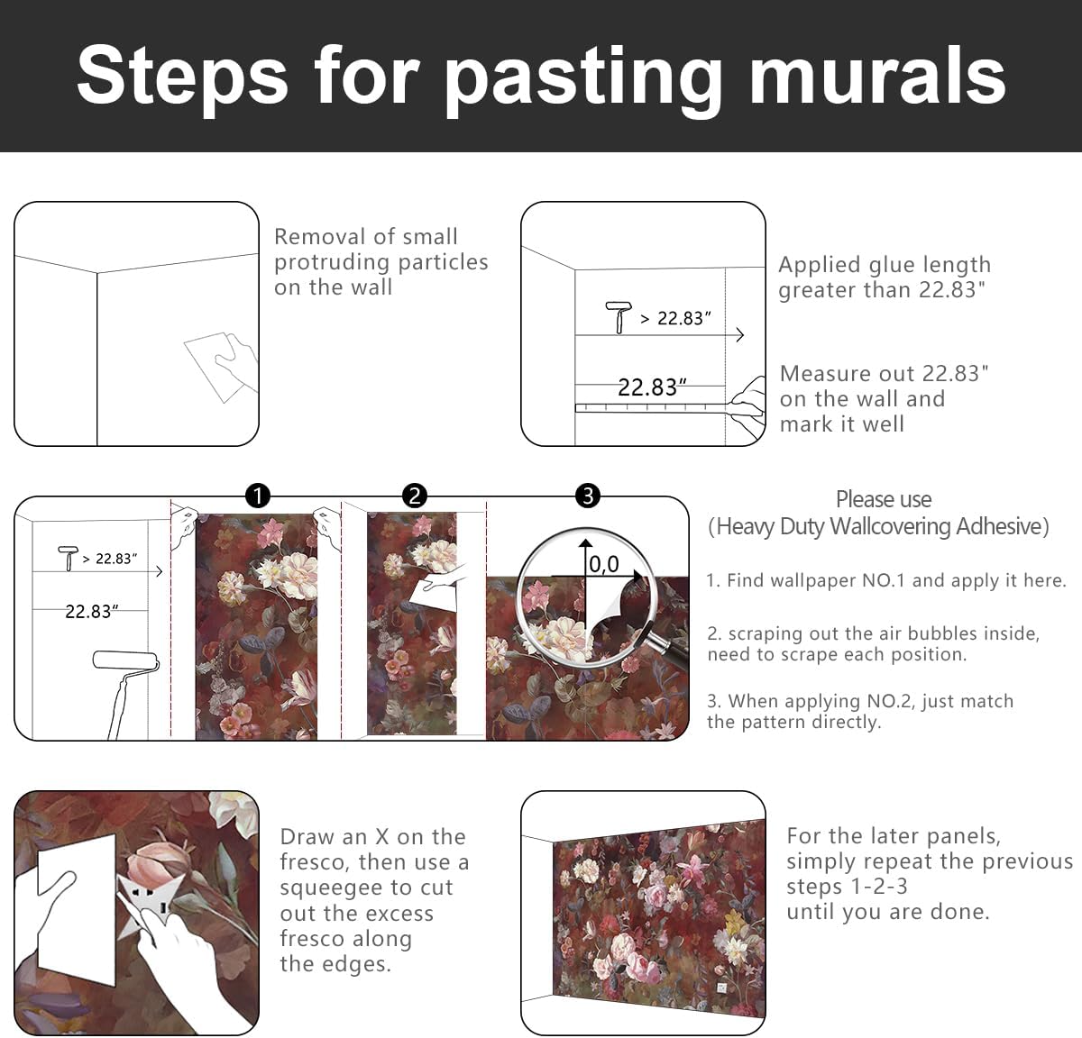 - This mural installation does not need to overlap, just match in order according to the marked order below the panel.