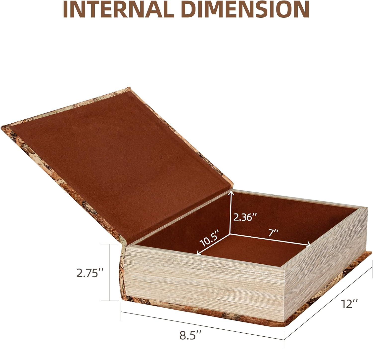 - Large Hidden Storage Compartment (12â x 8.5â x 2.75â) Spacious interior (10.5â x 7â x 2.36â) securely stores jewelry, letters, keys, or small valuablesâideal for discreet organization or creative home accents.