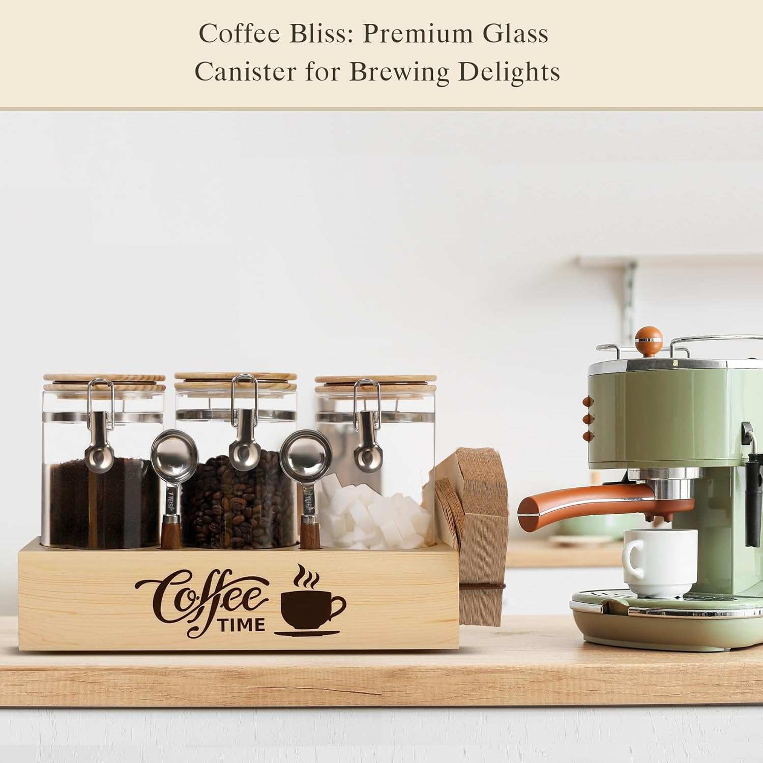 - đăDeluxe Borosilicate Glass Canistersă: Our coffee canister set includes three durable, heat-resistant, and shatterproof glass canisters, ideal for safe, reliable, and aesthetic storage of coffee beans, tea leaves, sugar, nuts, and more kitchen staples.