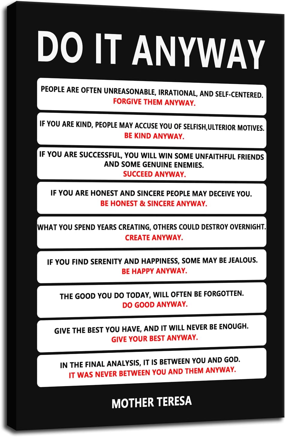 Do It Anyway Canvas Wall Art for Living Room Inspirational Mother Teresa Quote Poster Wall Decor Paintings Wooden Framed Artwork Bedroom Kitchen Home Decoration Ready to Hang[12''W x 18''H]