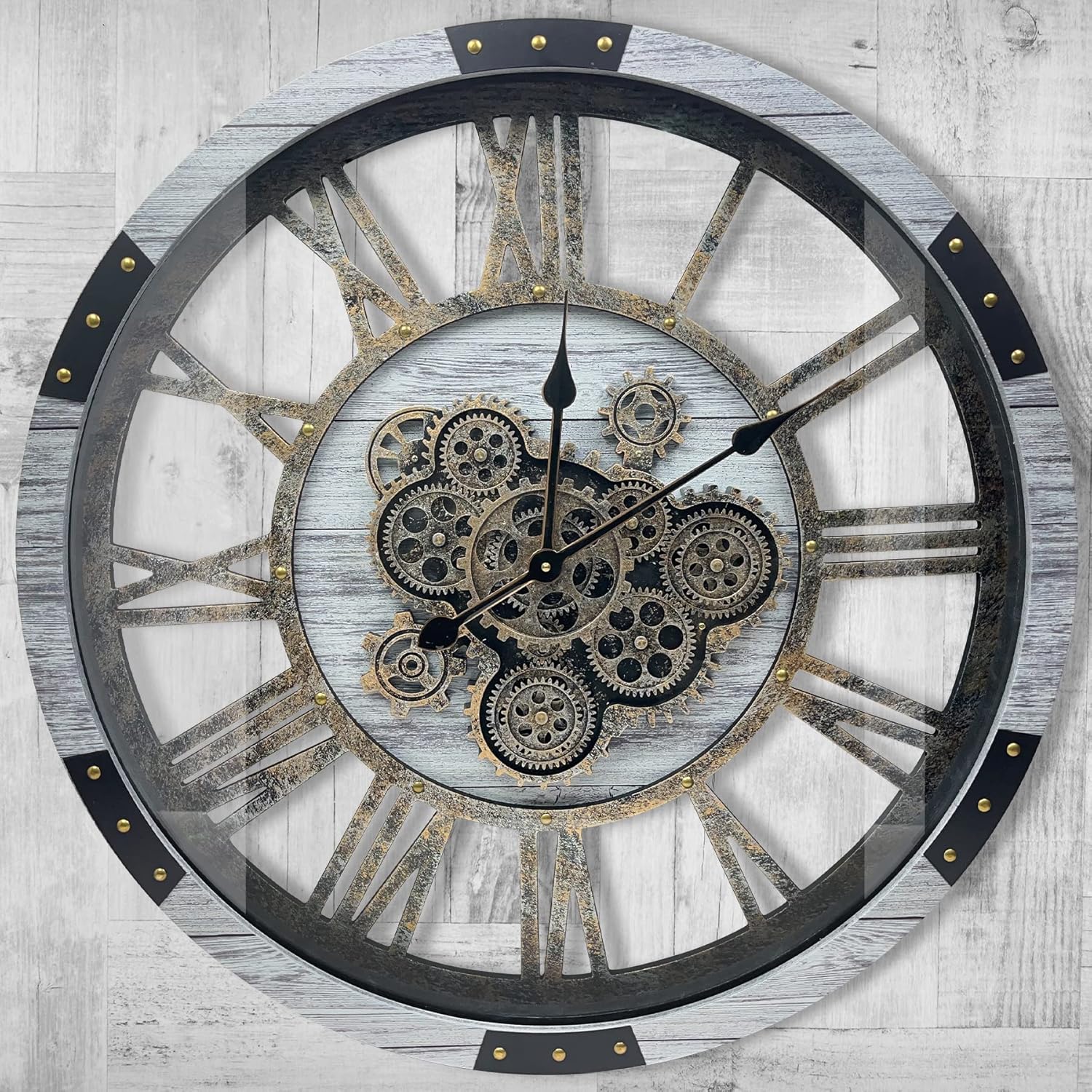 DORBOKER 40" Original Moving Gears Wall Clock, Large Industrial Wall Clock for Living Room Decor,Oversized Wood Vintage Farmhouse Steampunk Rustic Clocks for Wall Decor,Silver Grey