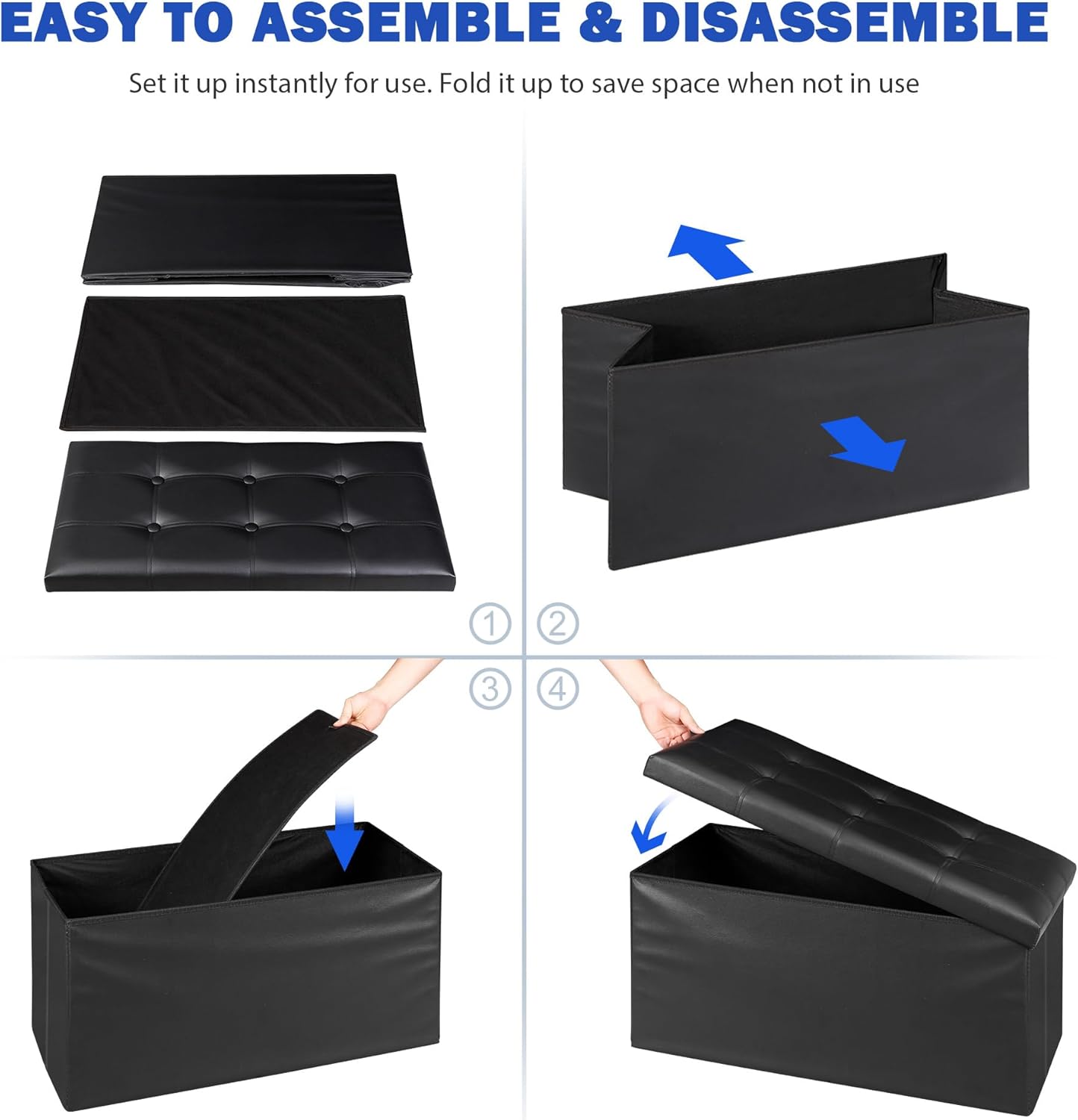 - ăEasy to Assemble & ServiceăThe item consists of three components: a lid, a fold-out storage ottoman, and a base piece designed to be placed at the interior bottom of the ottoman. No tools needed. It is like opening a collapsible box, you just open it up and may takes you about 2 minutes to assemble.