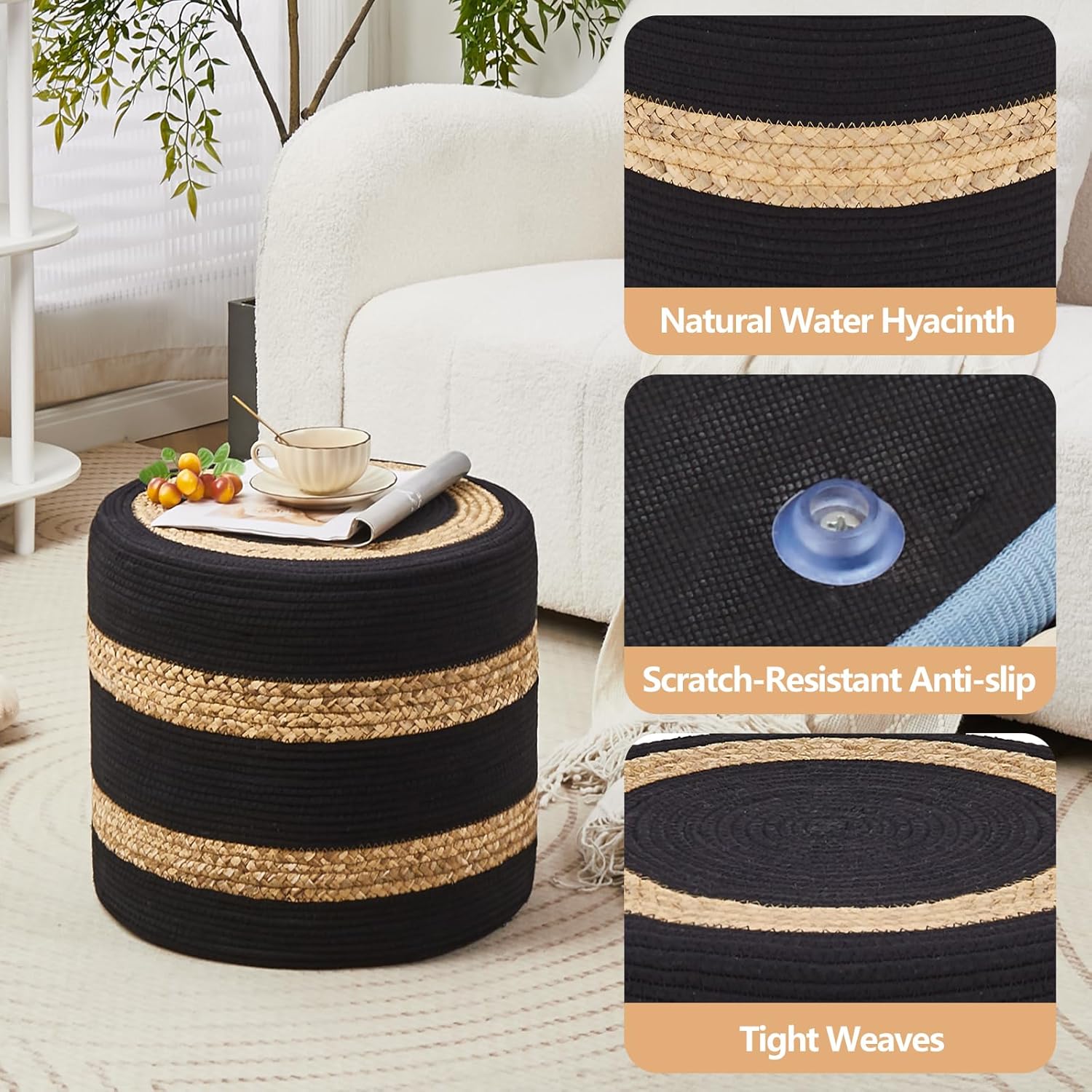 Wimarsbon 18'' Ottoman Pouf, Natural Braided Poof, Rustic Handweave Lounge Pouffe, Boho Footrest Stool for Bedroom, Accent Table or Seat for Living Room (Natural Water Hyacinth + Black Cotton Rope)