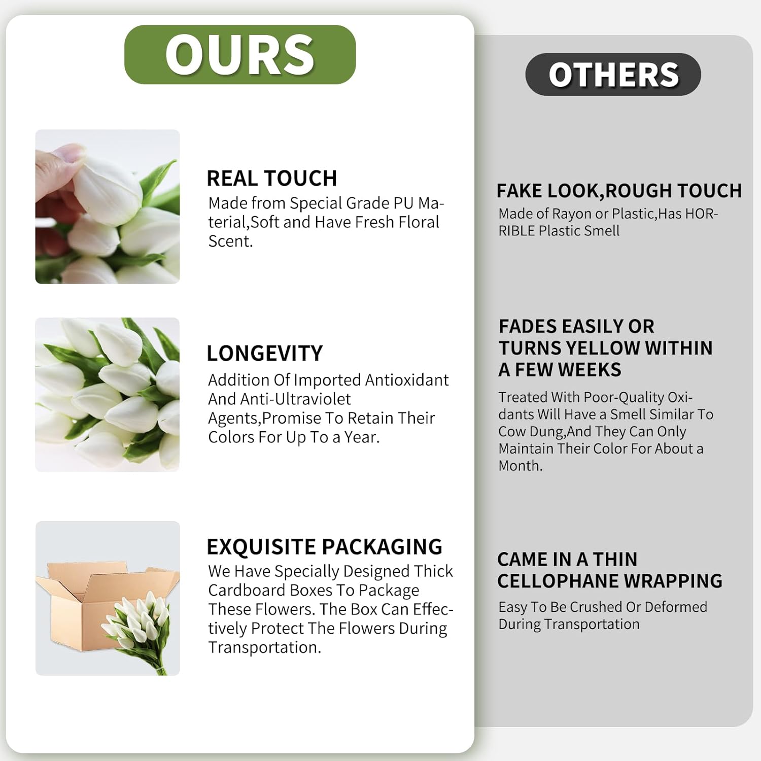 - What sets our tulips apart is their longevity. With the addition of imported antioxidant and anti-ultraviolet agents,these tulips promise to retain their colors for up to a year,ensuring lasting beauty in any environmental condition. Note: Artificial flowers without UV inhibitors will turn yellow within 2 weeks under sunlight,and those treated with poor-quality oxidants will have a smell similar to cow dung or burning plastic,and they can only maintain their color for about a month.