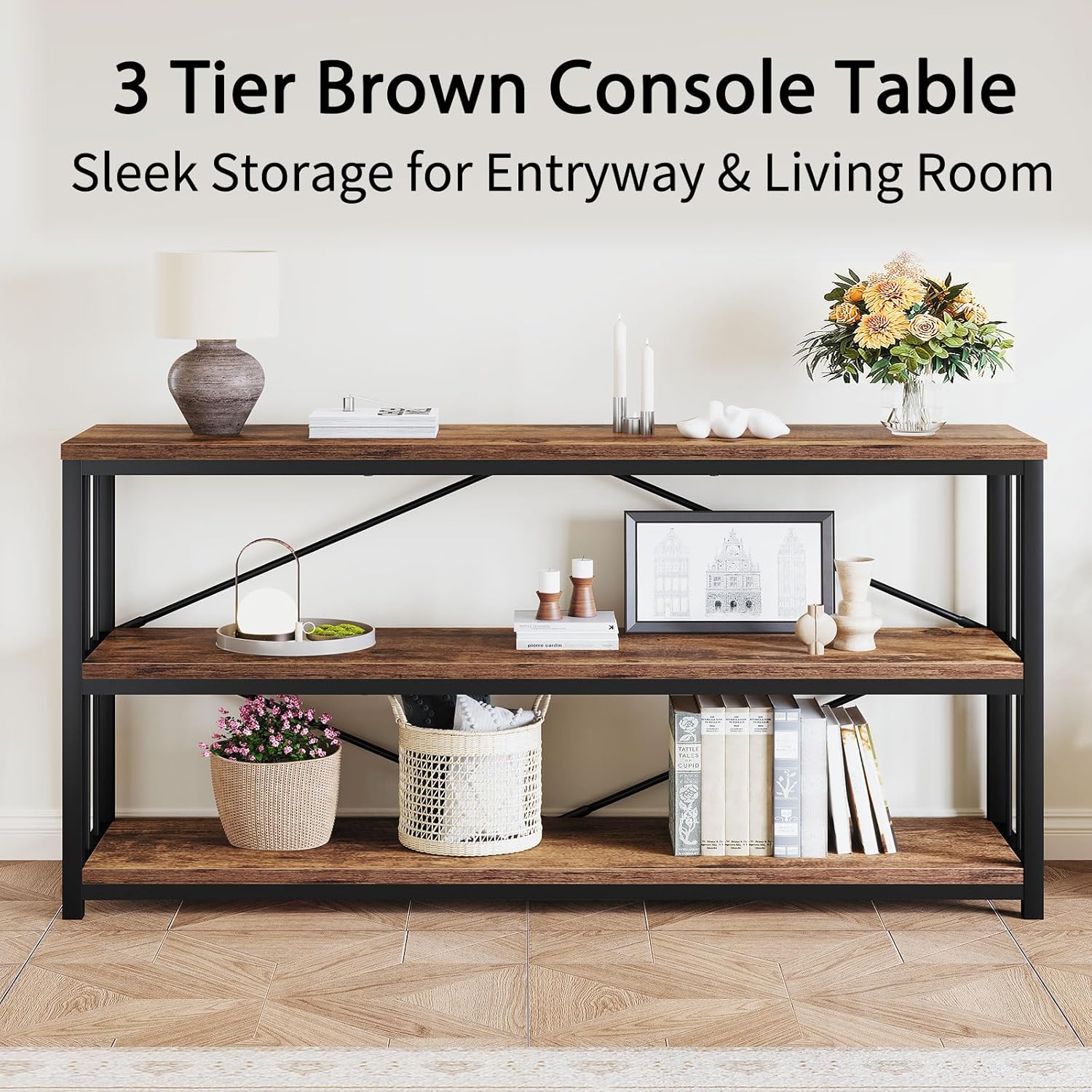 LVB Rustic Entryway Table, Industrial Extra Long Hallway Sofa Table, Wood Metal Narrow Console Table with Storage Shelf, Modern Skinny Couch Table for Foyer Living Room Bedroom, Rustic Brown, 70 Inch