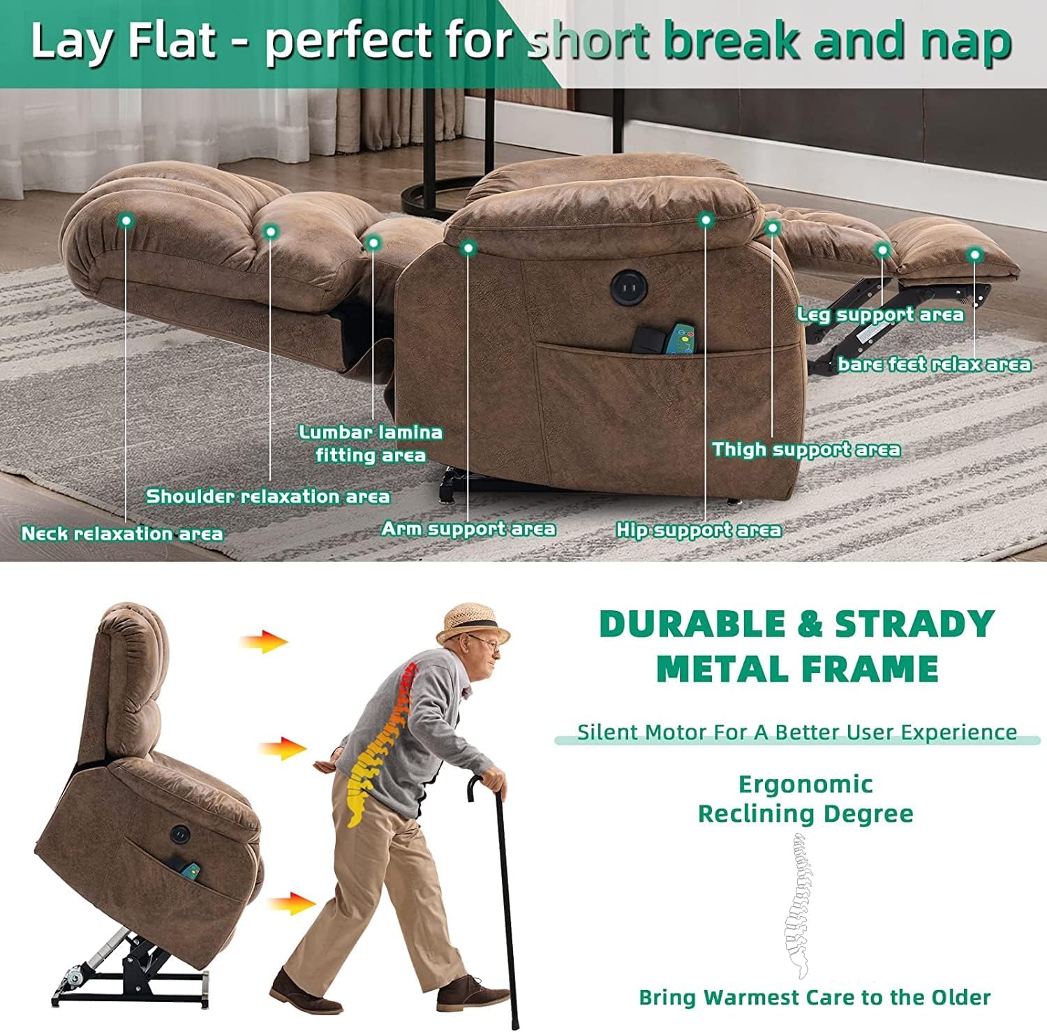 - 【Deeper Seat & Delicate Fabric】This upgraded power lift chair is equipped with oversized and wider armrest, back and seat, which make it an ideal choice for people in bigger size. Overstuffed upholstery padded with high density sponge brings comfort, once you take a seat, you'll never want to get up. The bronzing suede fabric with a special process to bring a leather-like visual finish on the suede surface, soft to the touch, eco-friendly and breathable, wear-resistant and stain-resistant.