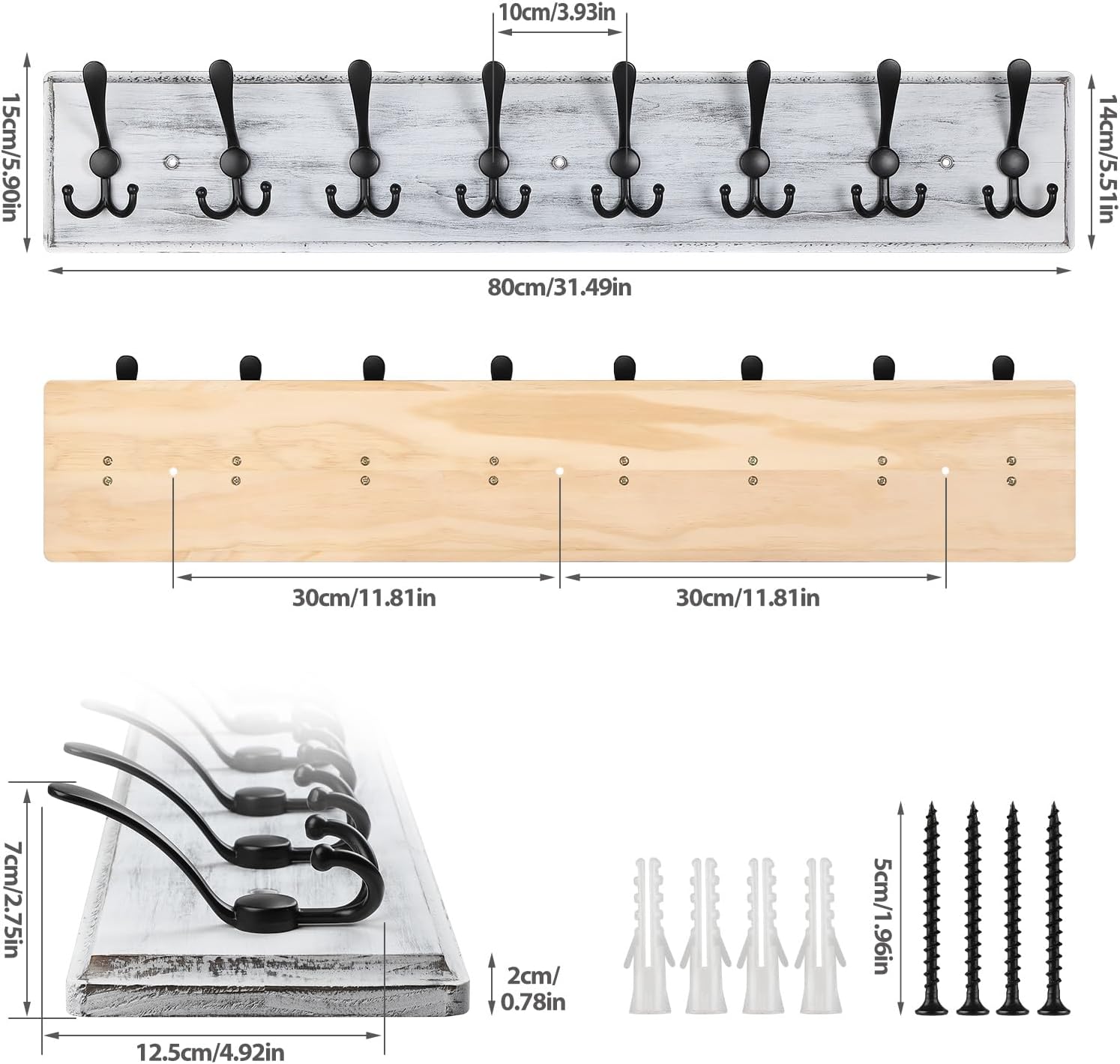 - [Sturdy wall coat hanger] The wood of wall mounted coat hook is made of pine wood. The clothes hook is fixed on the board and made of anti-rust zinc alloy. The hook tip is smooth and does not hurt the clothes.The collision between zinc alloy and pine creates a rural and retro atmosphere