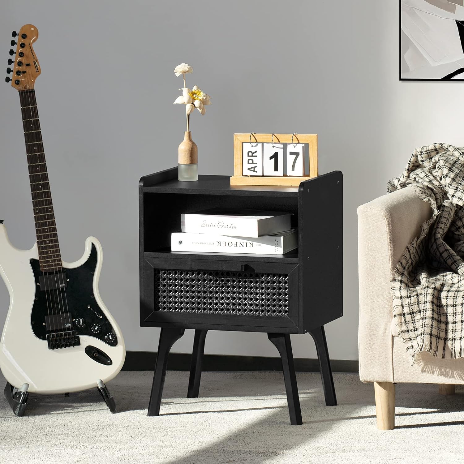 - [Black Rattan Nightstand] The wood texture rattan night stand combines modern style and boho element. It is suitable for many styles of home decor and can help you transform your living space. The cane decorated drawer is beautiful and practical and the rattan mesh design keeps the air flowing in addition to the storage. Rattan furniture brings a perfect visual effect and adds charm to your home.