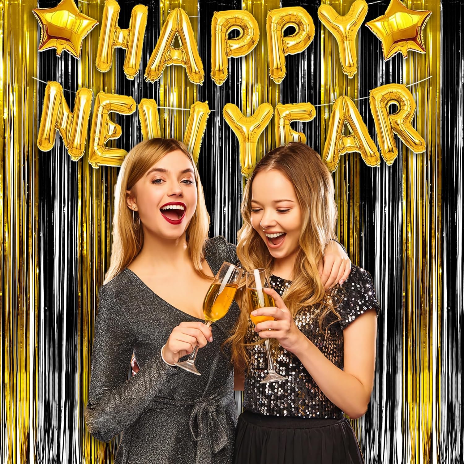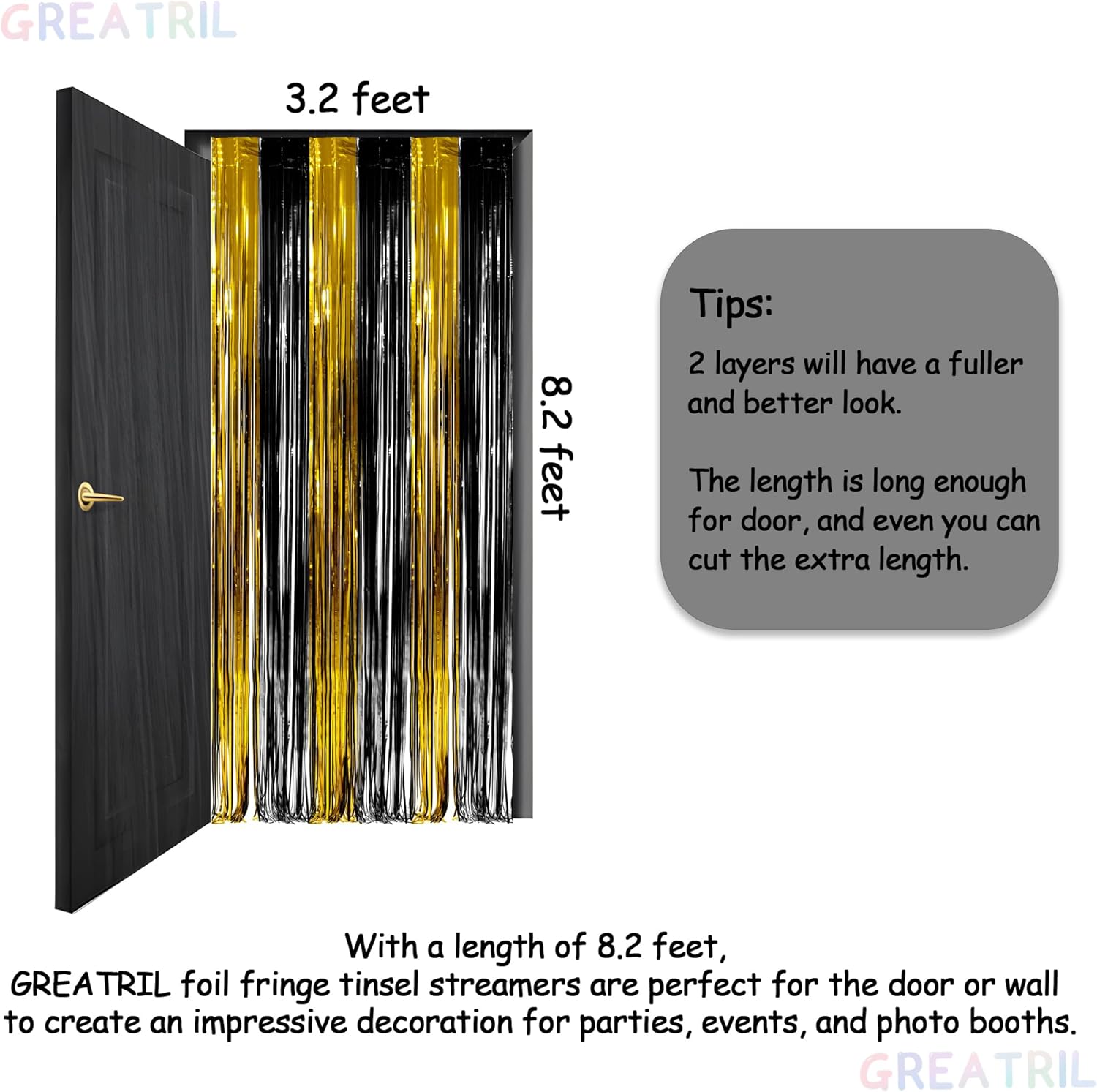 Black and Gold Party Streamers Decoration - GREATRIL Foil Fringe Backdrop for 2025 NYE/Anniversary/Farewell/Cocktail/Prom/EID/Birthdays - 3.2ft X 8.2ft - 2 Packs