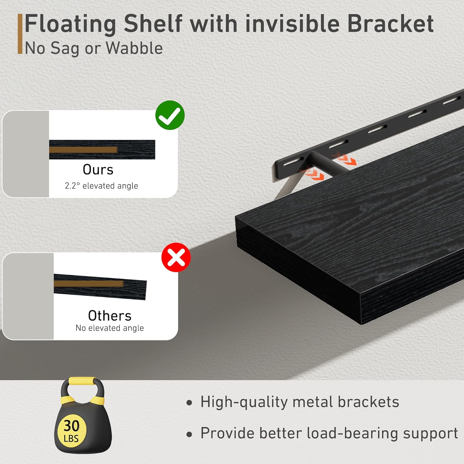 Fun Memories Deep Floating Shelves - 16" W x 9" D x 1.6" H Rustic Black Wall Shelf - Wall Mounted Shelves for Storage - Wooden Shelves with Invisible Brackets for Living Room, Farmhouse - Set of 2