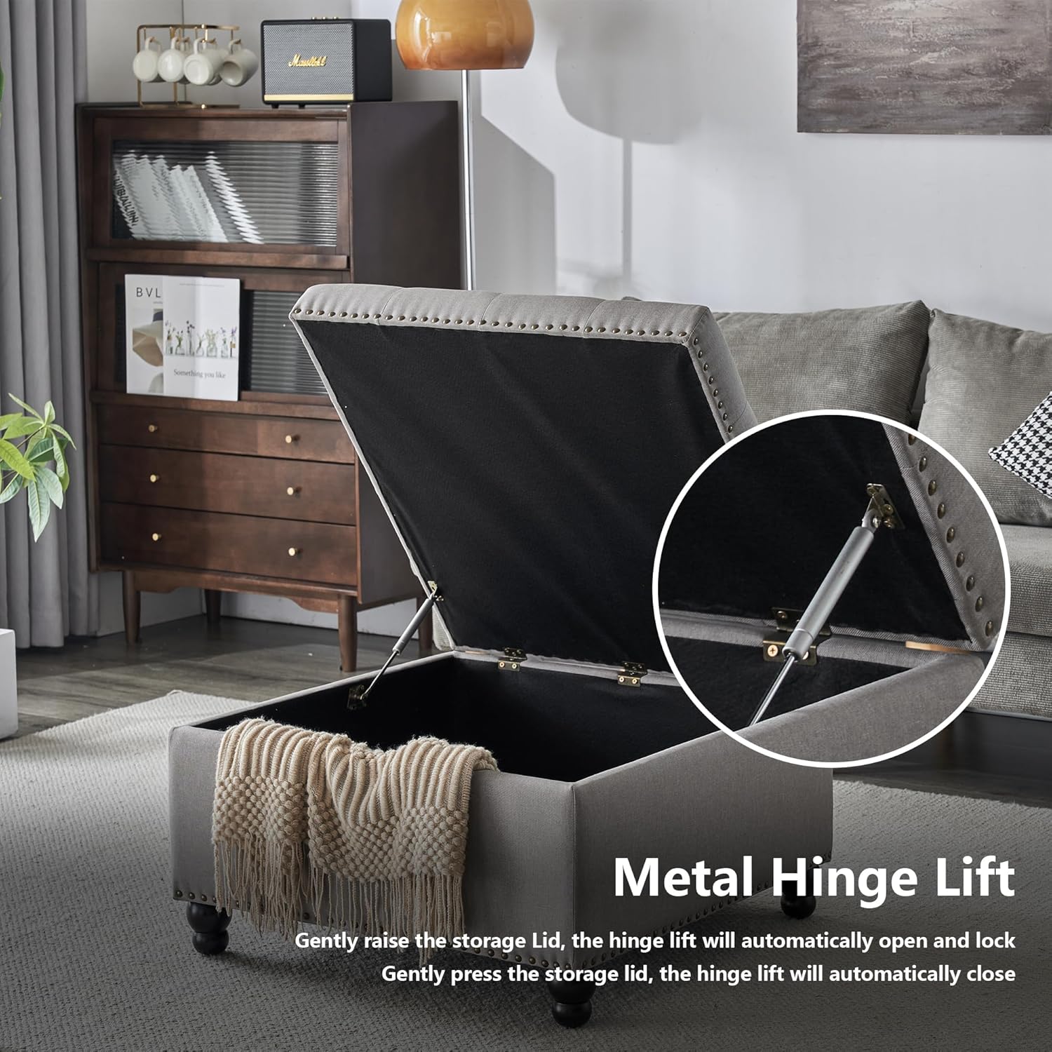 - ăBuilt-in Storage Compartmentă Our oversized coffe table ottoman features an extra room to store your things,the ottoman's top opens up to reveal a spacious compartment perfect for storing home essentials like throw pillows and blankets.