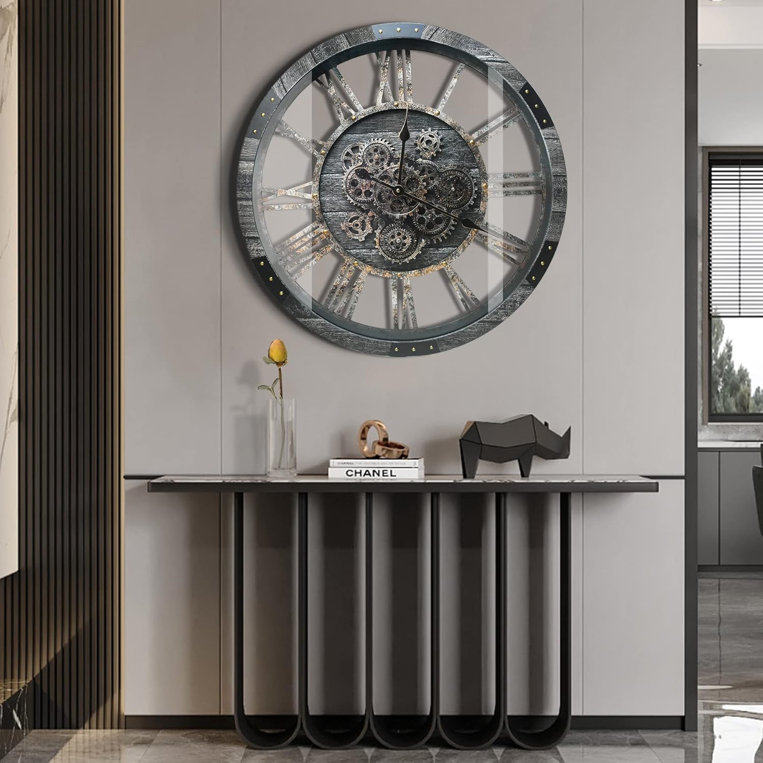 - đ§ăUnique Design, Only For Your Homeă Round solid Wood frame and classic retro skeleton with real mechanical moving gears in the central, the wooden frame is handcraft, showing unique attractive wood grain color and small natural knots; artificial rust-imitated treatment marks on the skeleton for vintage and industrial effect; stronger tempered glass resists any breakage and keeps safety whenever; The design is very different from other clocks, just to break the ordinary, only for your home.