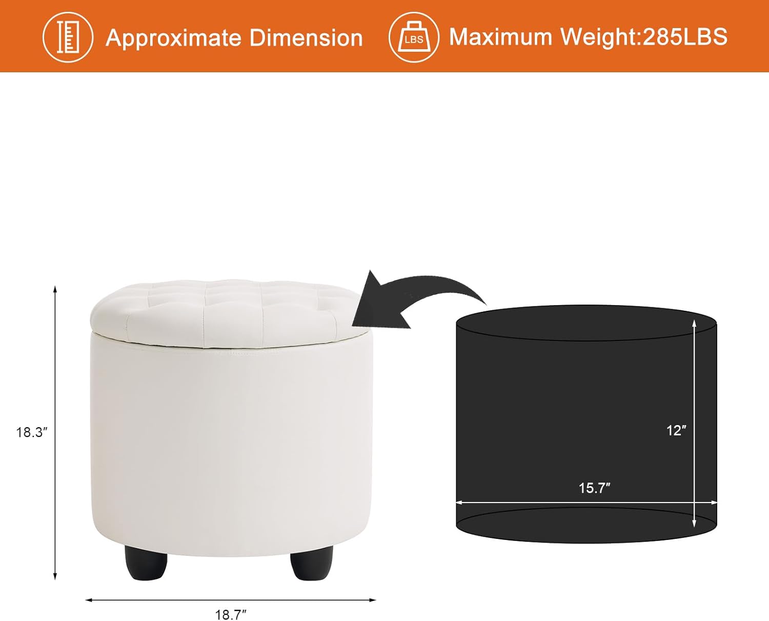 - [Perfect Size] - 18.7"Round; 18.7"D x 18.7"W x 18.3"H. Weight up to 285LBS. The footstool has solid and durable legs which can not be easy to collapsed. The storage ottoman round is also fairly lightweight, which makes it easy to move around. The foot stool also has perfect height to match your couch and you can put your feet up on it.